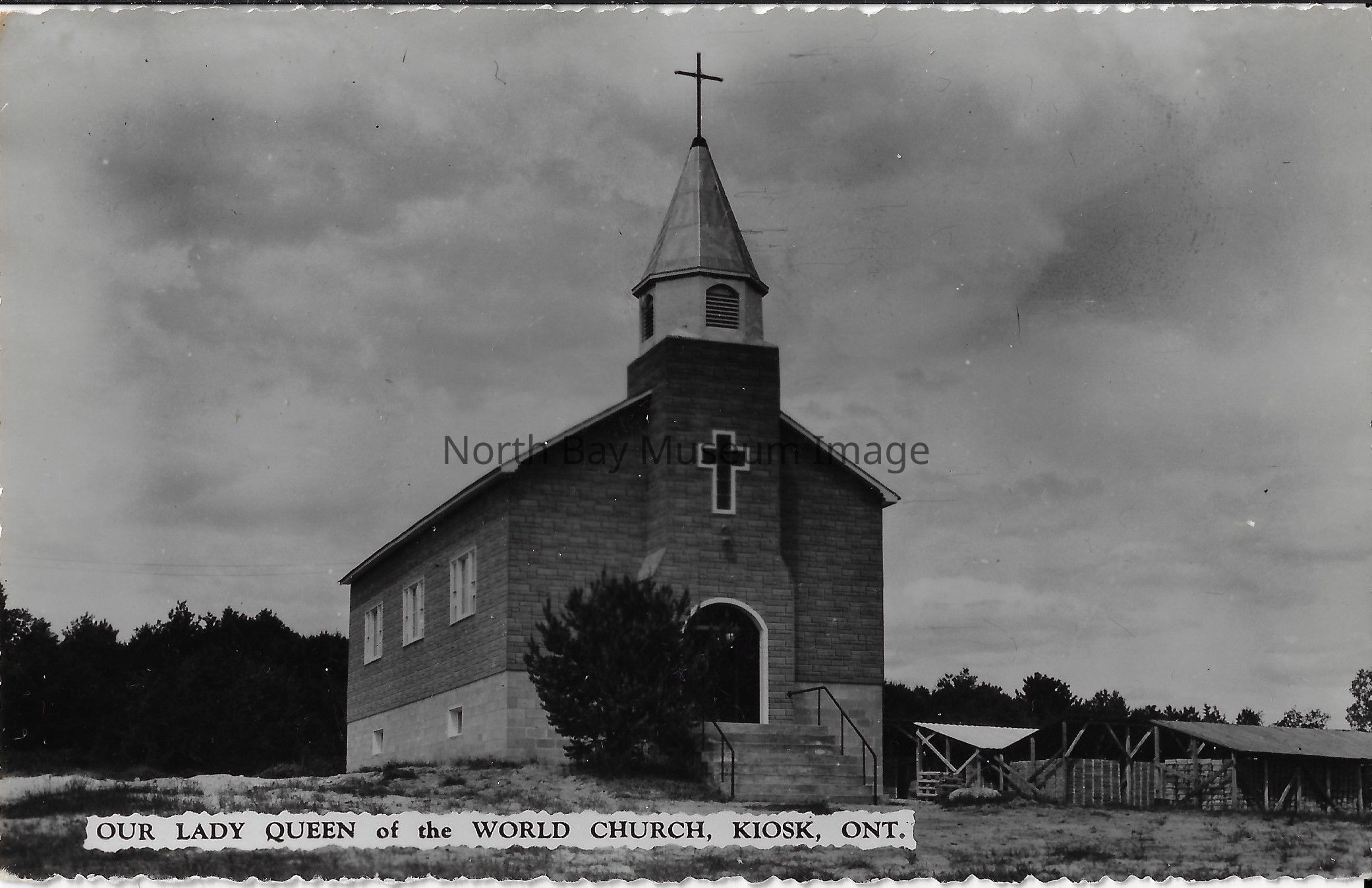 This is a black and white postcard displaying a church. The church is in the foreground of the postcard. There is a black and white cross on the front of the church. The location of the church appears to be a secluded area. On the right hand side appears to be some construction equipment. The caption of the postcard reads "Our Lady Queen of the World Church, Kiosk, Ont."Date(s) of Creation