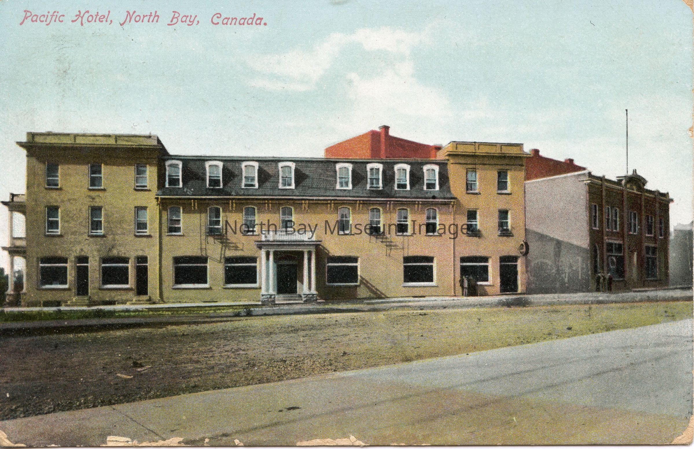 Postcard with color image of Pacific Hotel (later called the St. Regis Hotel). The hotel was built in 1886 to cater to rail traffic; located at the corner of Toronto Street (now Oak Street) and North Bay Road (now Algonquin Avenue). Partially Demolished/heavily renovated in 1981.