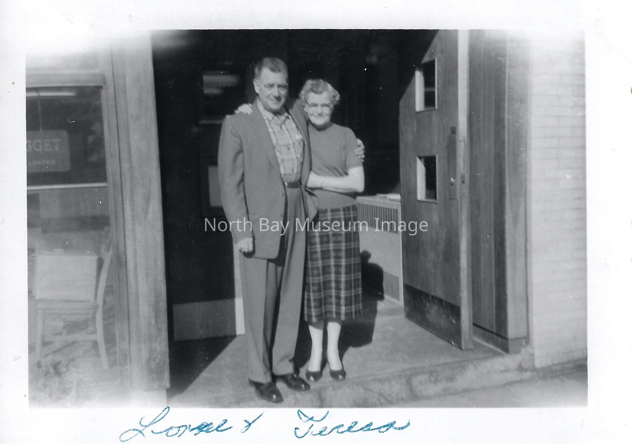 021.40.46a: Photo. Exterior of North Bay Nugget office looking down street. 021.40.46b: Photo. Inscription: "Lorne Moon & Theresa Cahill; Nugget".