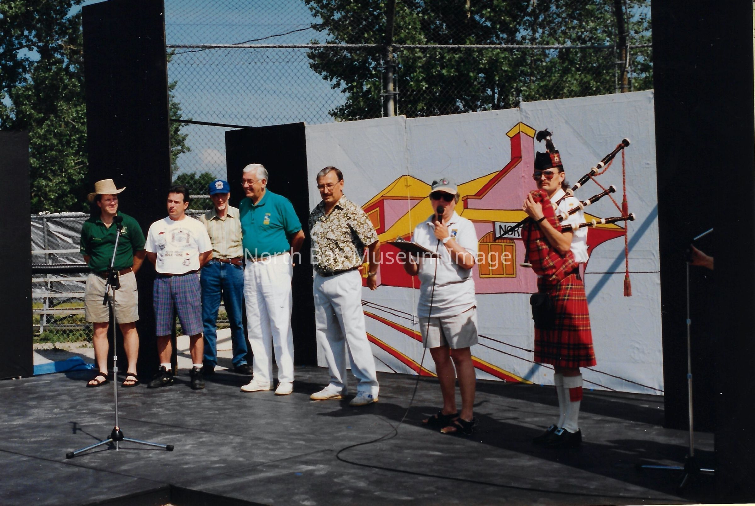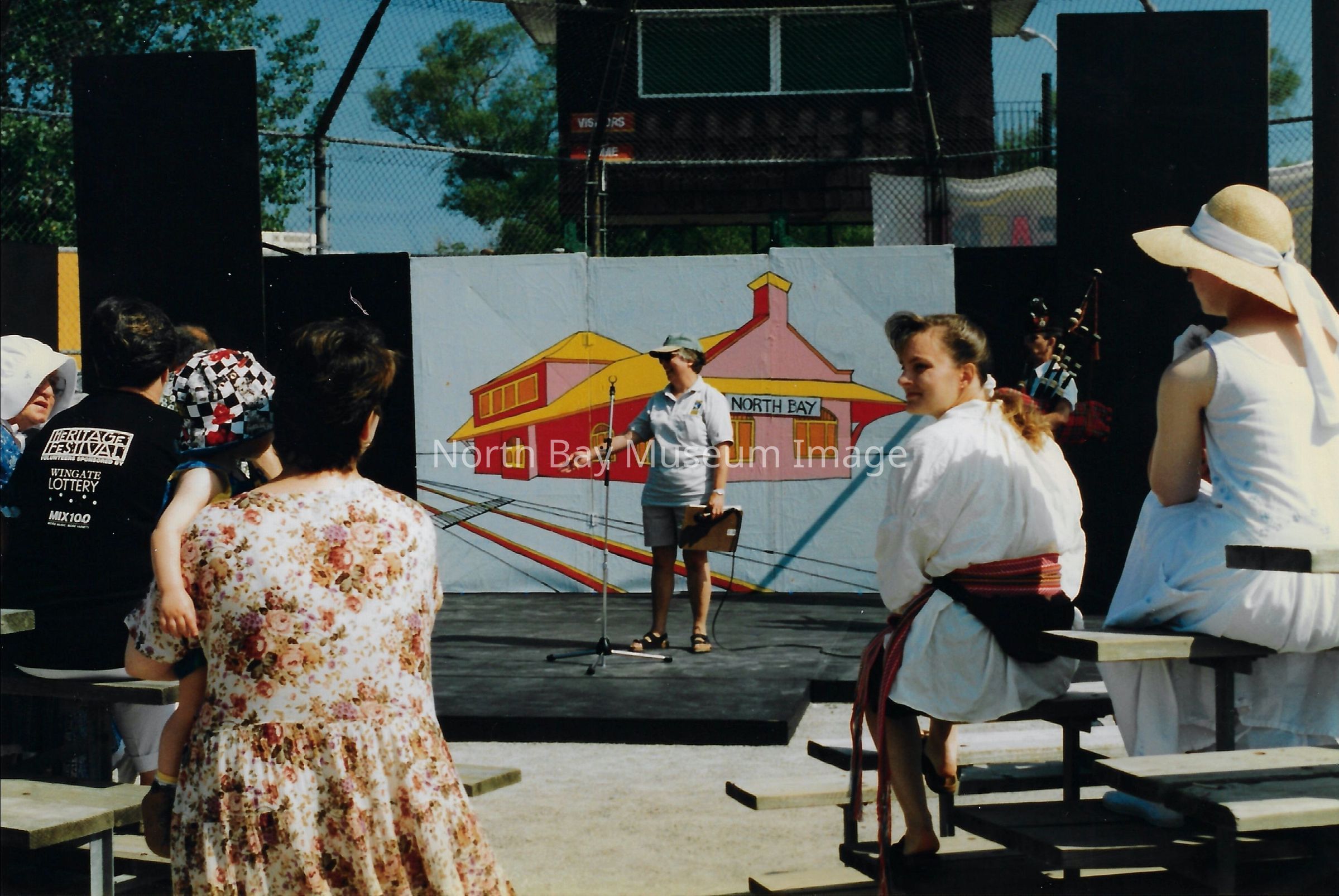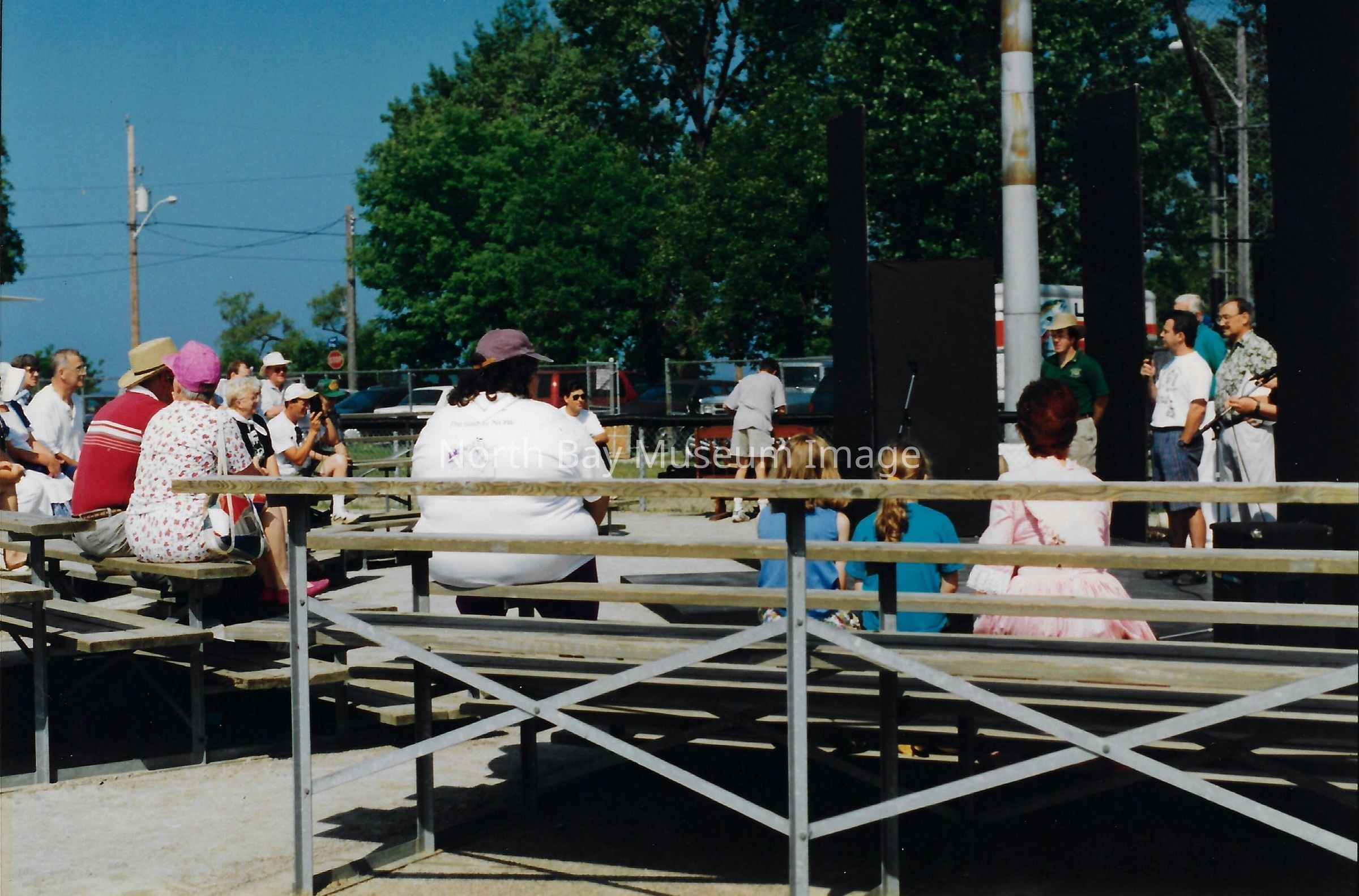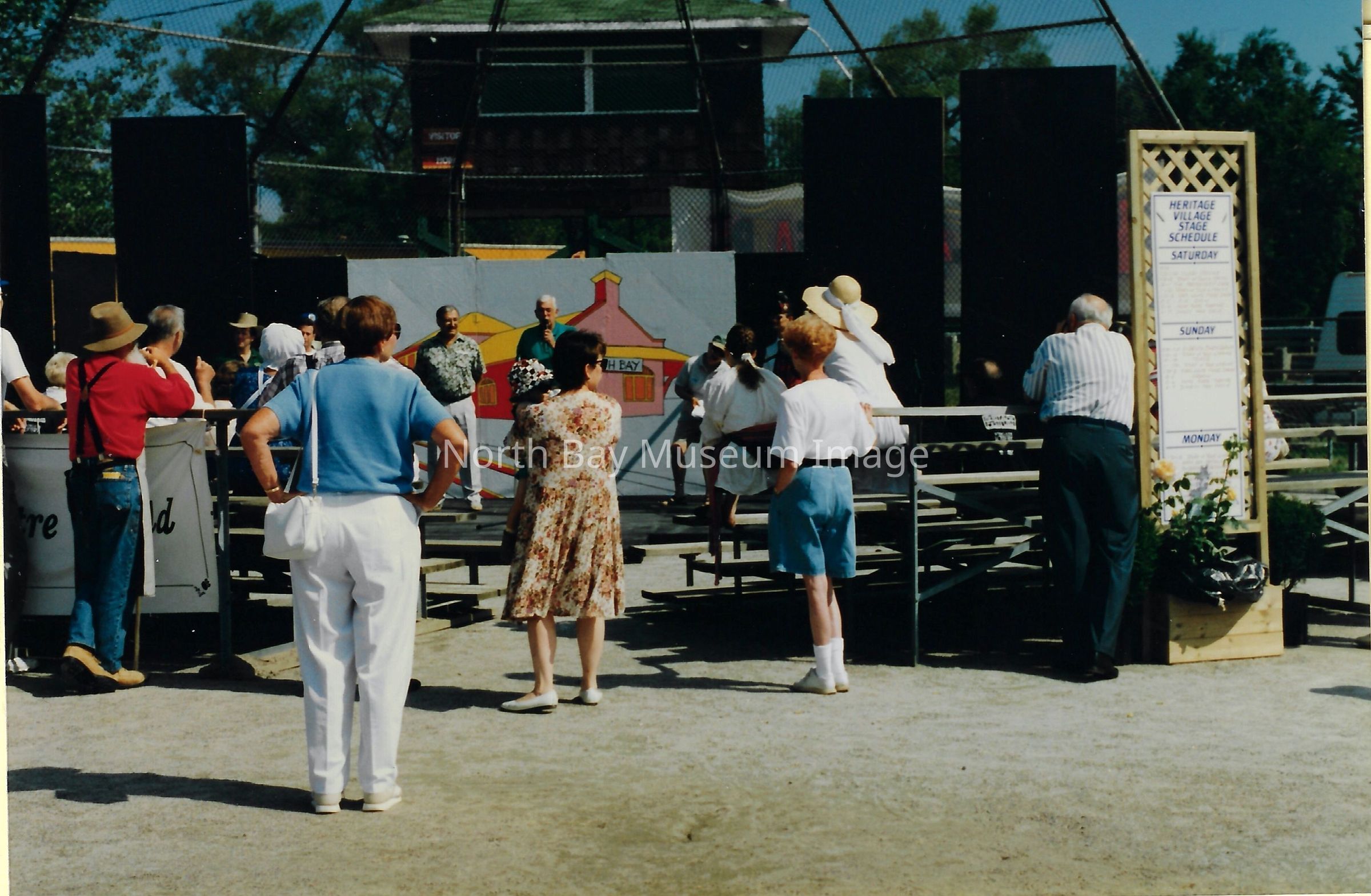 021.40.49j: Photo. Crowd gathered at baseball diamond to watch Gateway Theatre Guild play. Inscription: "GTC- Putting on Play about North Bay".
