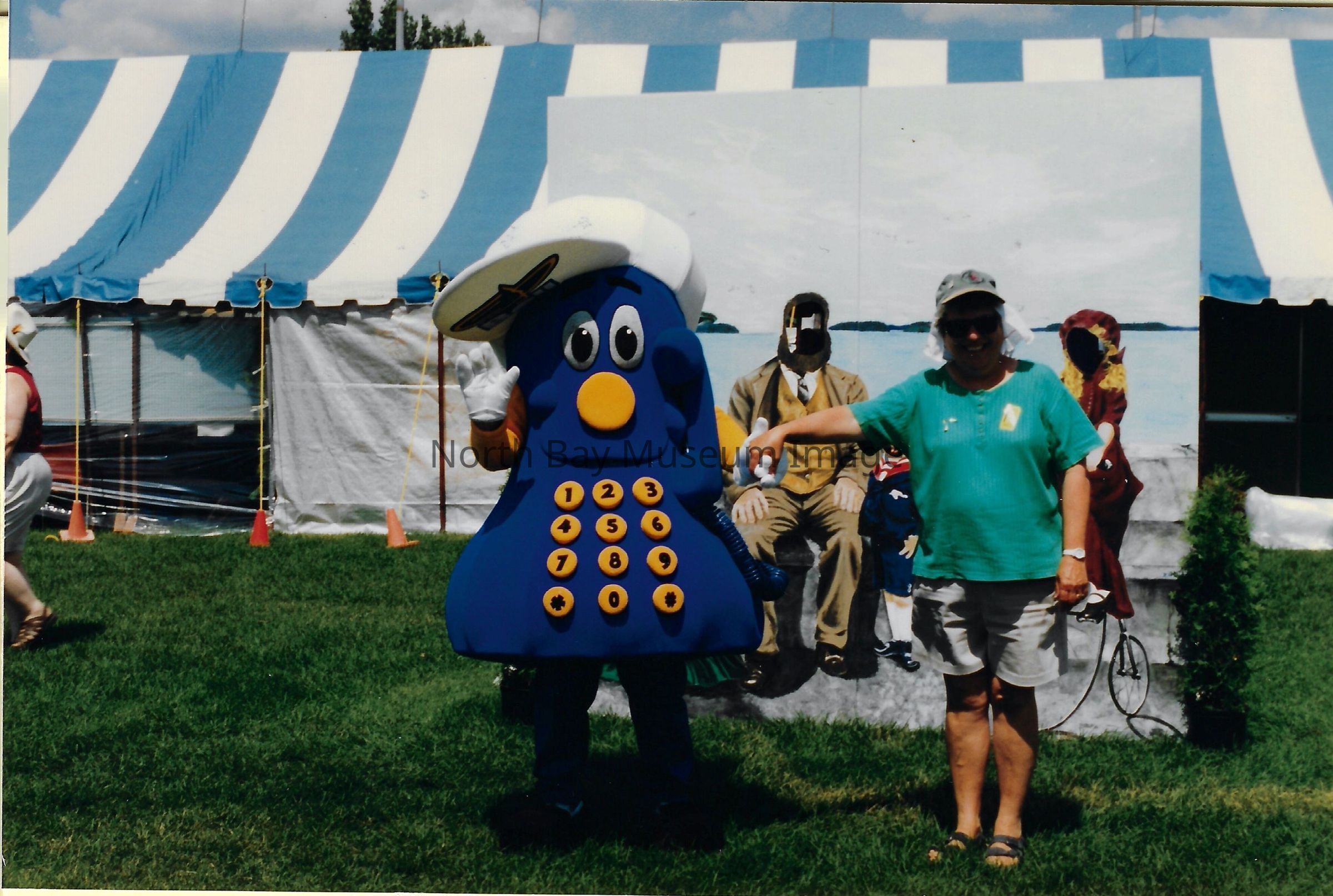 021.40.49k: Photo of Pam Handley next to Bell phone mascot. Inscription: "Pam & Bell".