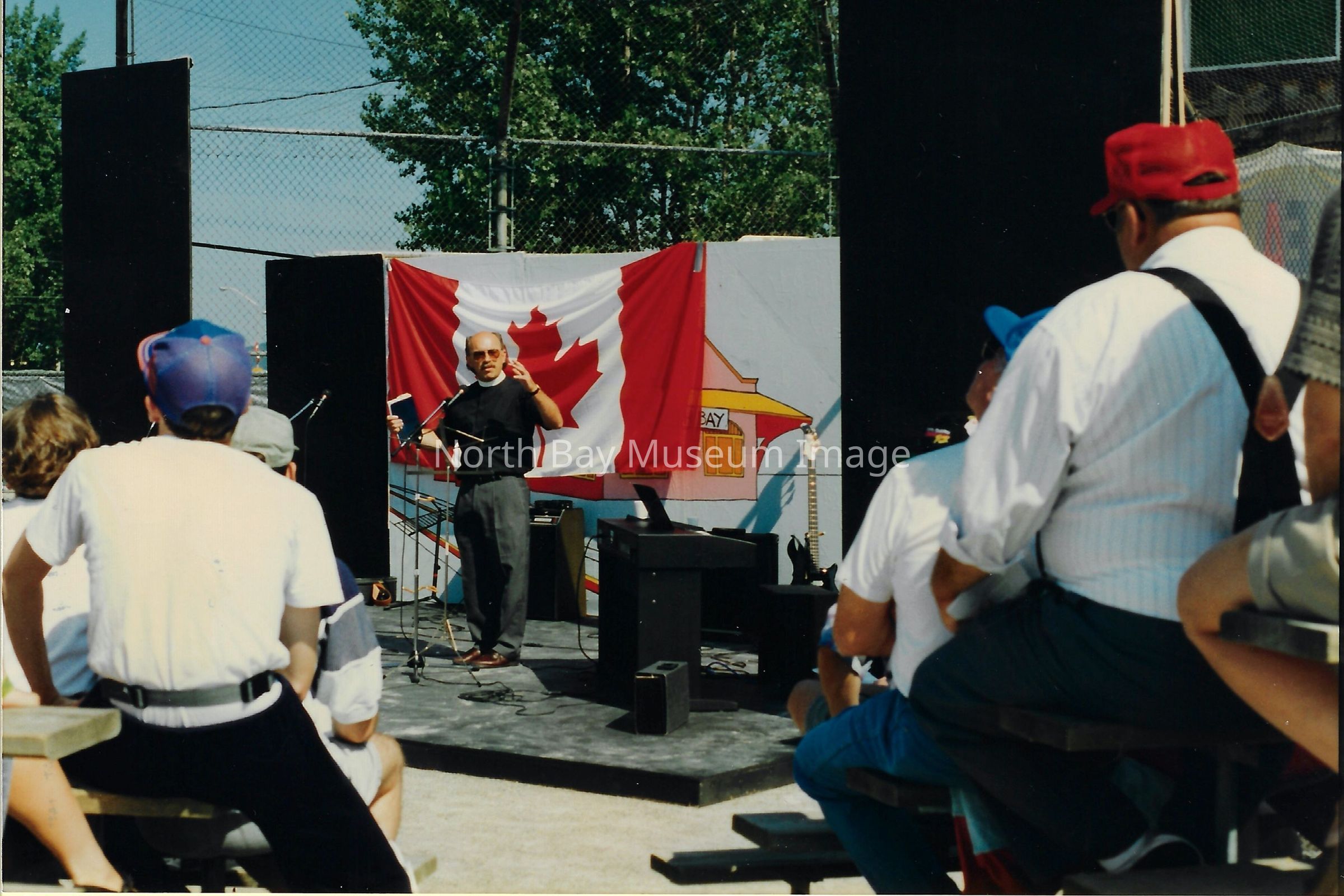 021.40.49n: Photo of priest in front of Canadian flag speaking to crowd. Inscription: "Ron Jerry Smith- St Brice's".