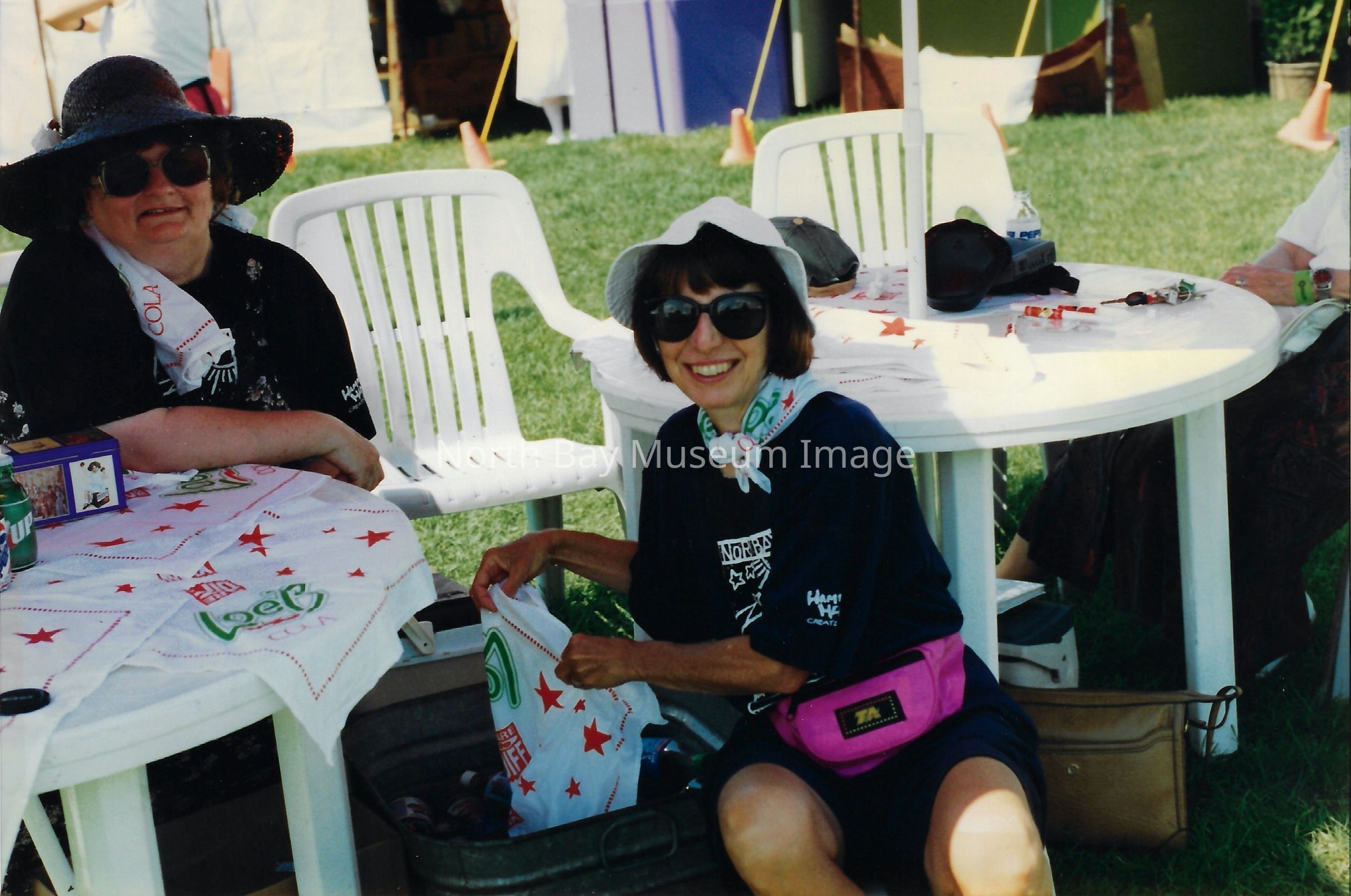 021.40.49o: Photo of two women at outdoor table with cola scarves. Inscription: "Charland-Black Hat; Penny Irwin".