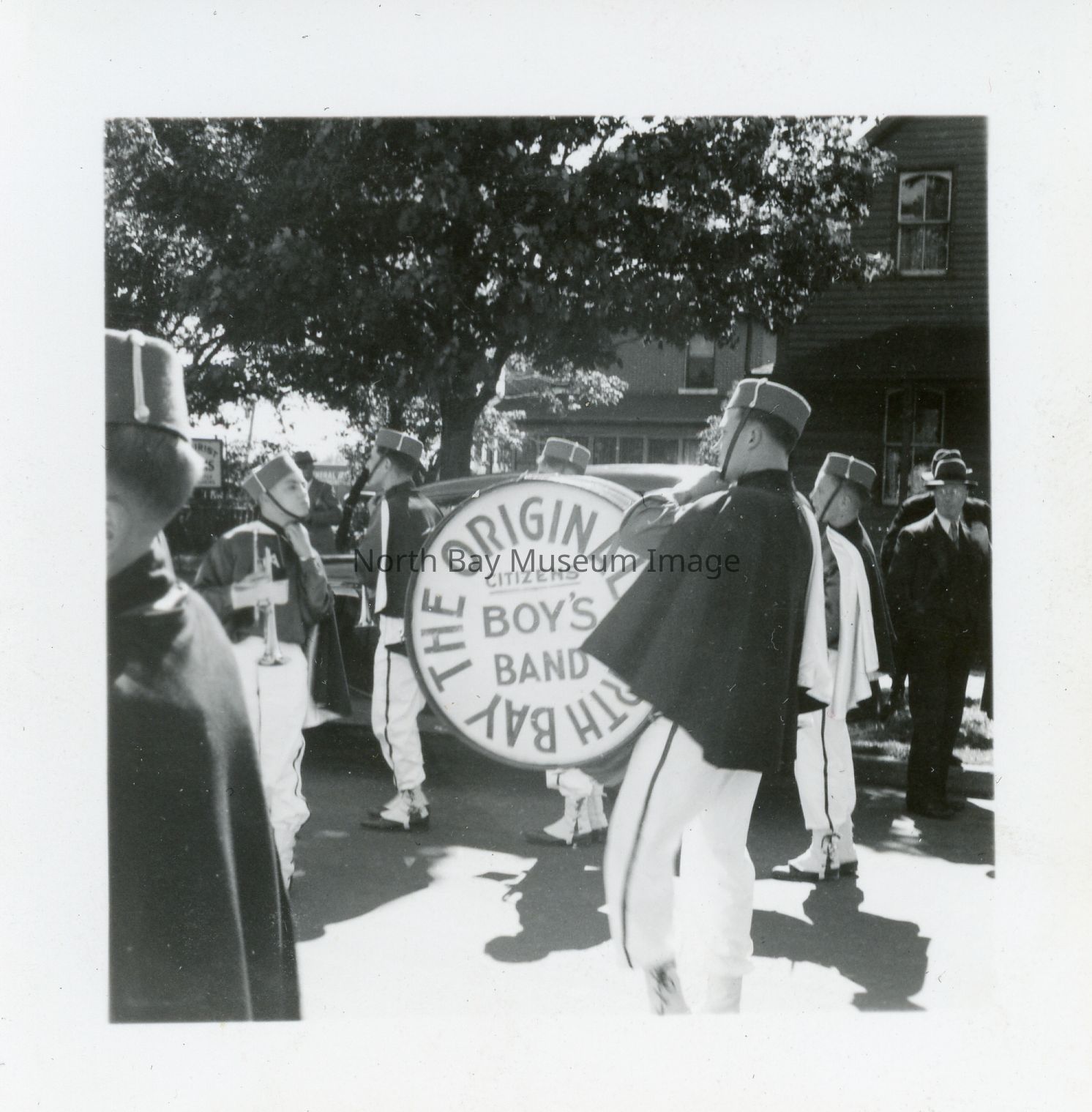 Photograph of parade with the Original Citizens Boy's Band North Bay . Musicians are in uniform and the group is identified by the writing on the drum in the centre of the image.