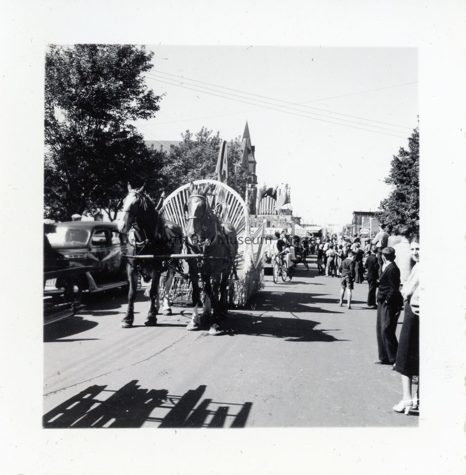 Photo of parade in downtown North Bay. Includes horses pulling float, spectators watching, and church steeple in background.