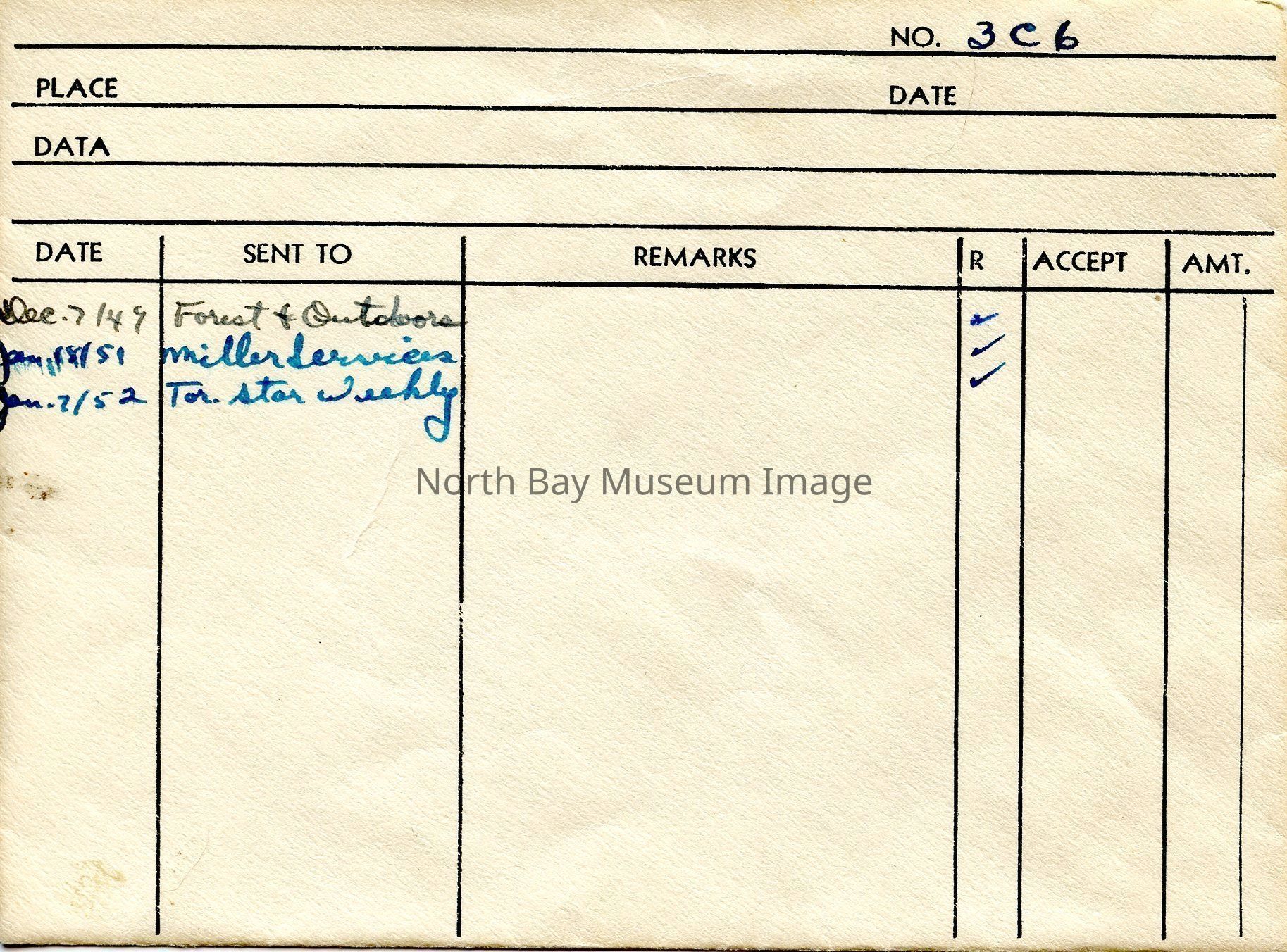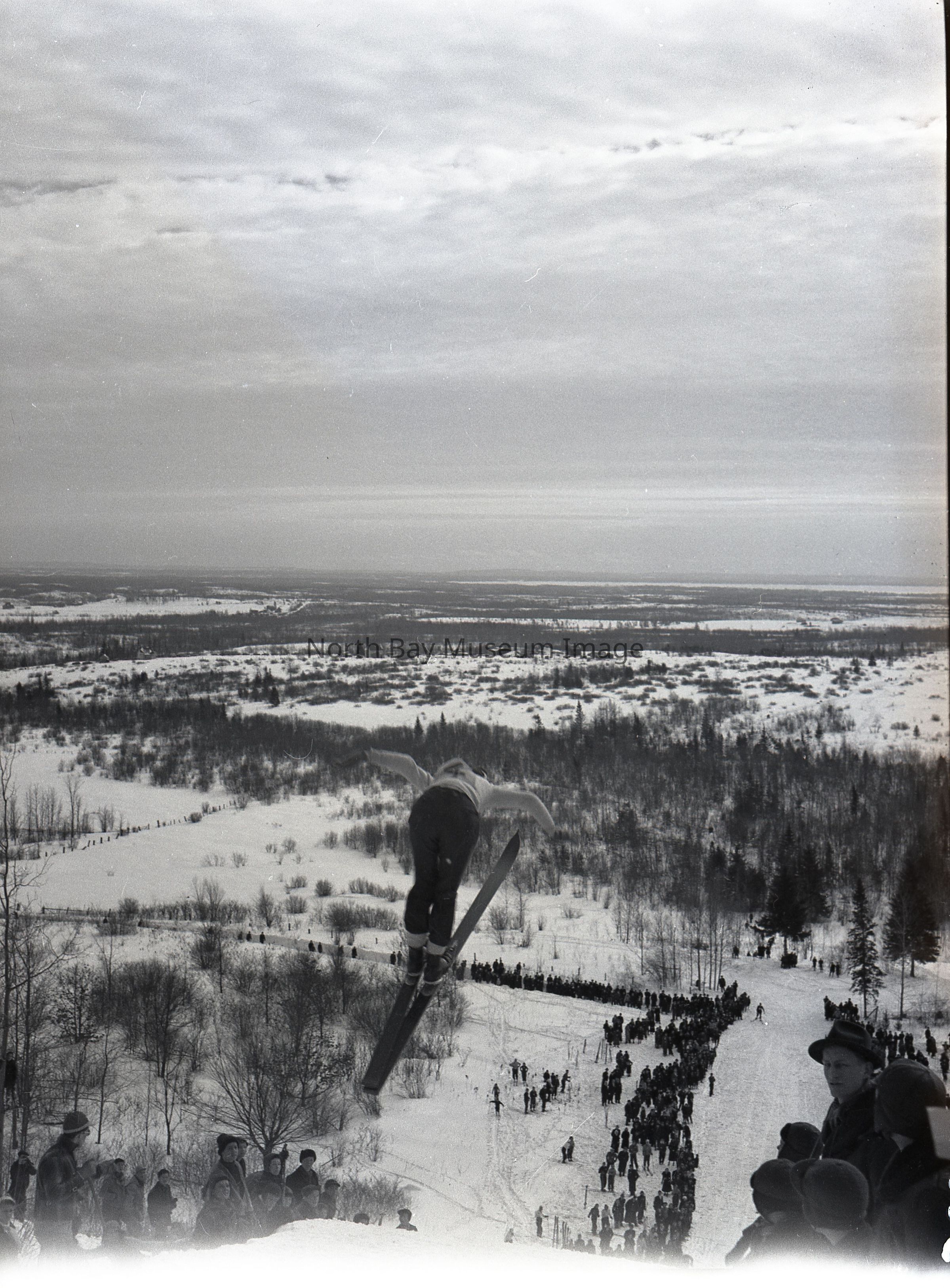 Envelope (a) containing negative (b) of a person attempting a ski jump at the Laurentian Ski Club. The image is a singular person mid air from a ski jump. The lake is visible in the background. A part of the Forder Collection. The photographers original number is 3c6. All of the photographs publications are listed on the the envelope.Creator
