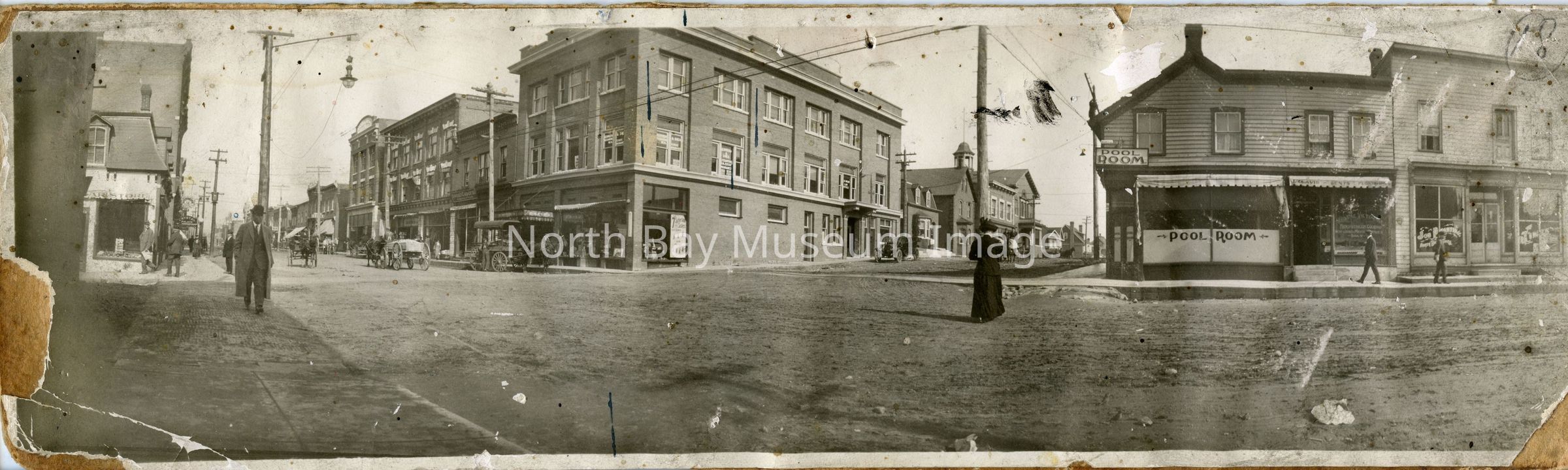 Long photo of Ferguson and Main panoramic street scene showing pool room, Mackey House hotel, cochrane dunlop store, and more. Scene is Ferguson street in centre of photo and panorama of Main Street on either side. Mostly horses and buggies with one car on Ferguson Street. Prior to paving of main street.Date(s) of Creation