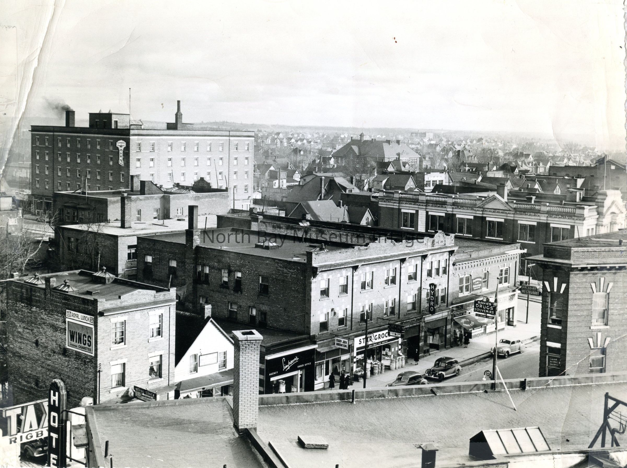 Photo of Main Street West between Fraser and Cassells street from top of St. Regis hotel. Shops/organizations pictured: "Empire Hotel", St. Regis Hotel, "Hydro", "Canadian National Railways", "Simpson's Agency", "Royal Lunch", "Mary Jane Hairdressing", "Arcadian Restaraunt", "Saya's Drug Store", Post Office, "Transportation Building".Date(s) of Creation