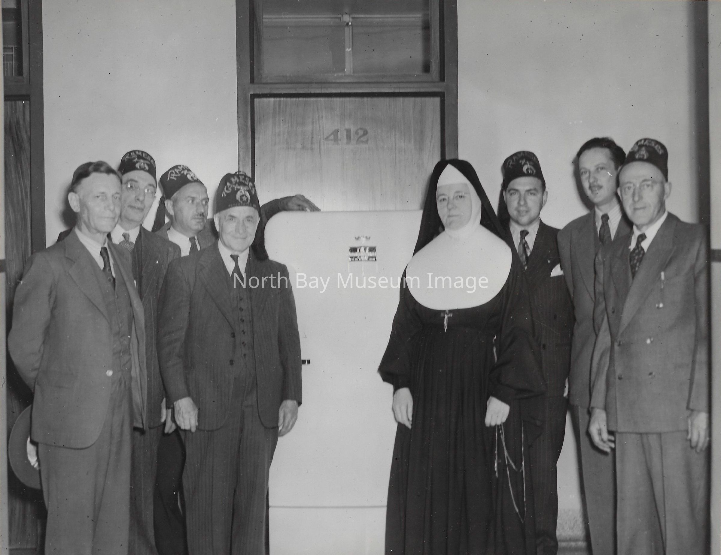 -A group of Shriners standing with a nun in front of a fridge.