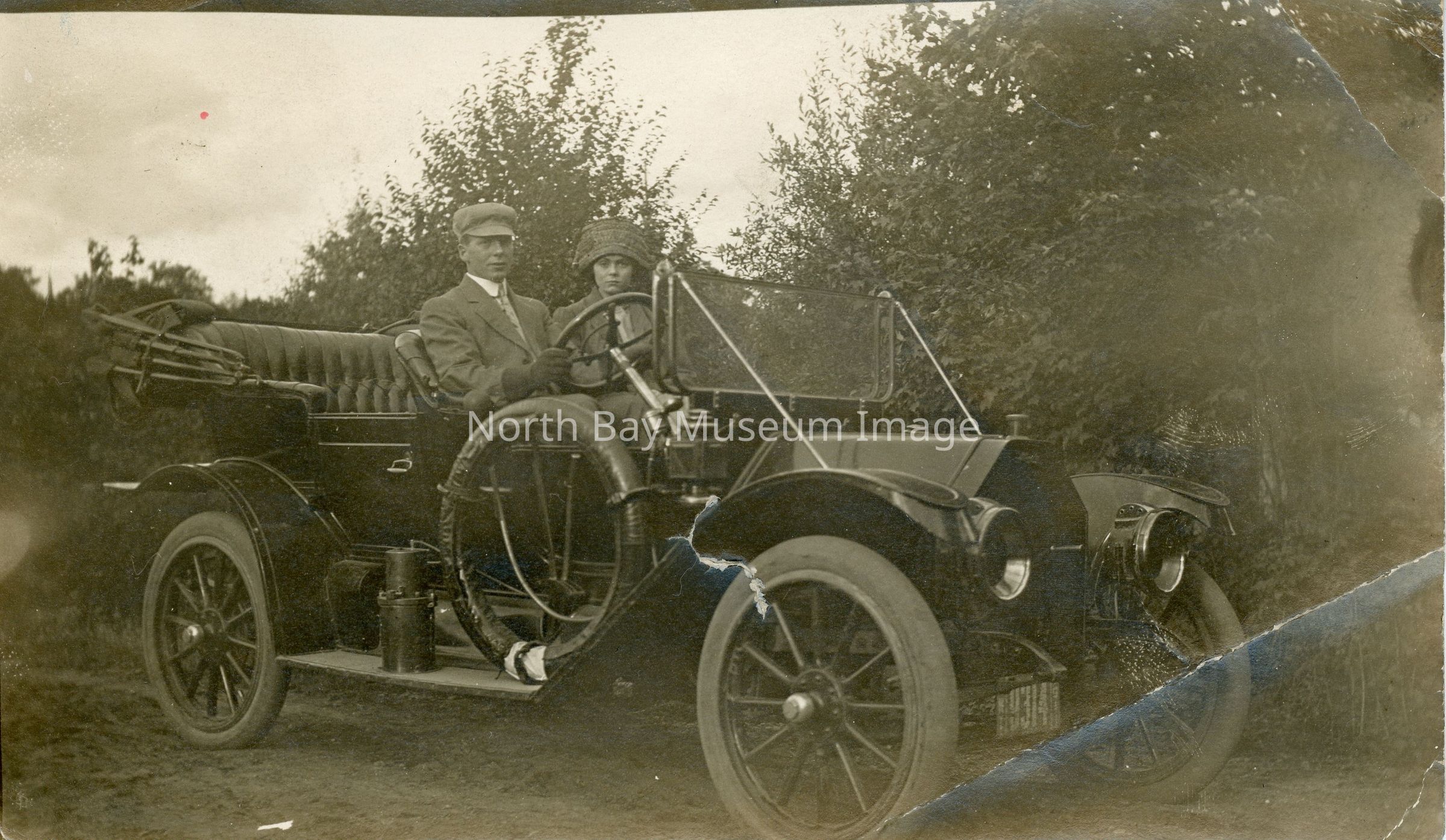 Photo of Flora and Alex Souter in honeymoon open car model buick, a McGlaughlin Car.