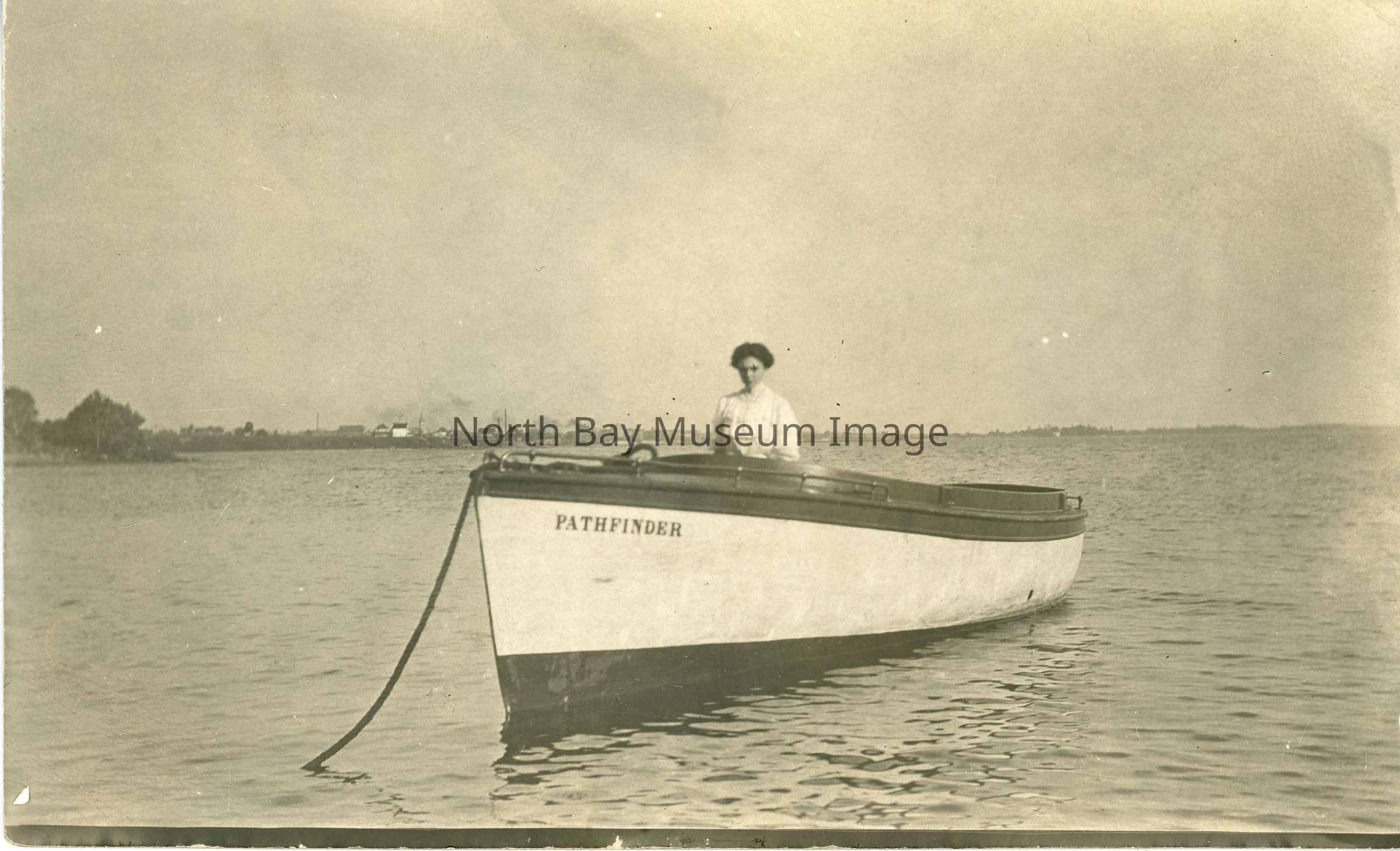 Sepia photograph of , Flora Baillie Souter sitting in the "Pathfinder" boat moored in lake. Born August 5, 1889 in Penetang ON.
