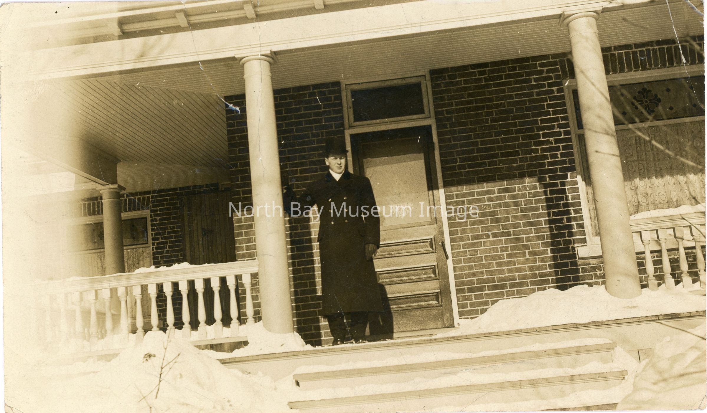 Photograph of man in long black coat and hat standing on porch with two pillars and snow. Possibly Alex Souter.