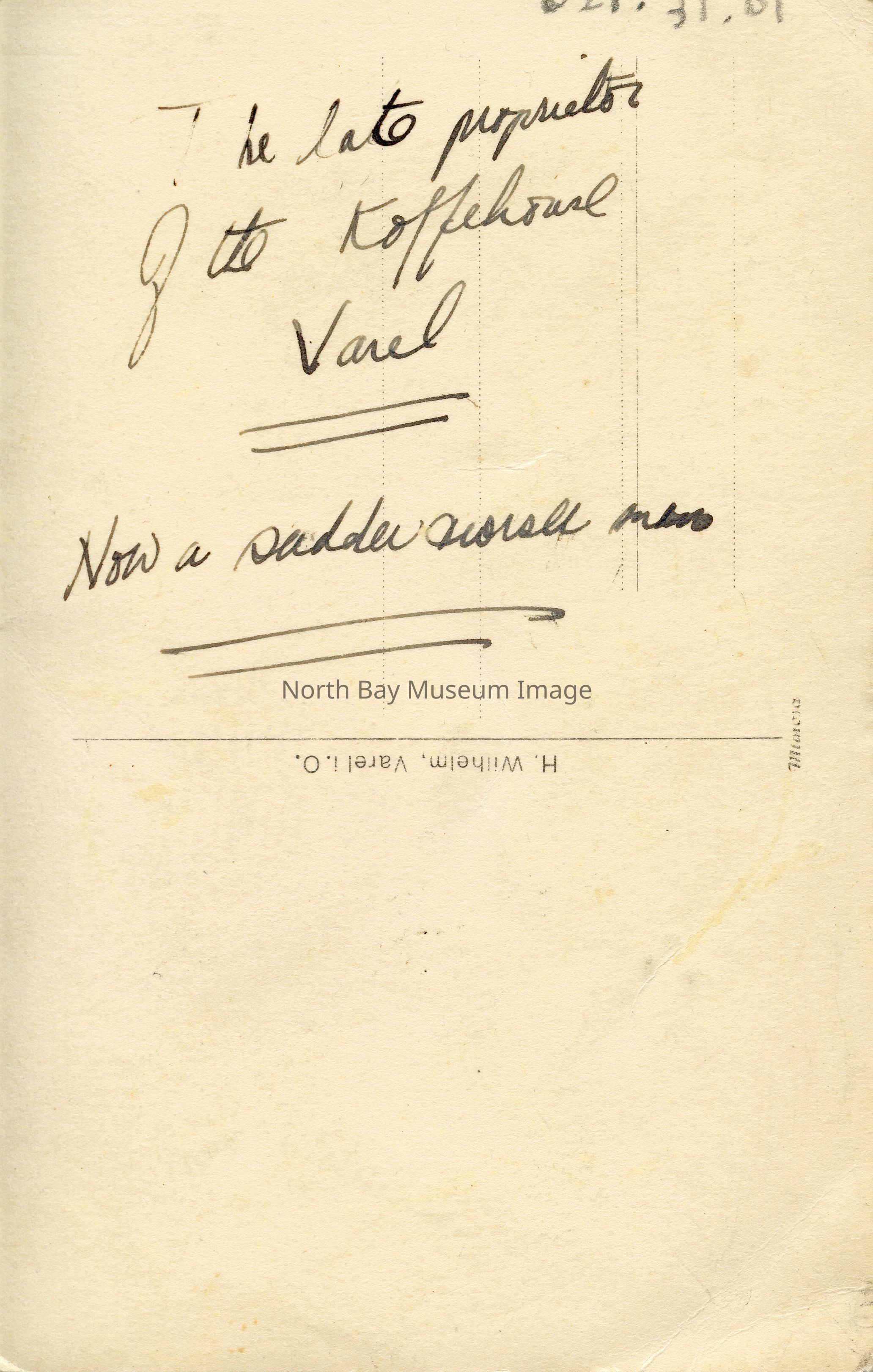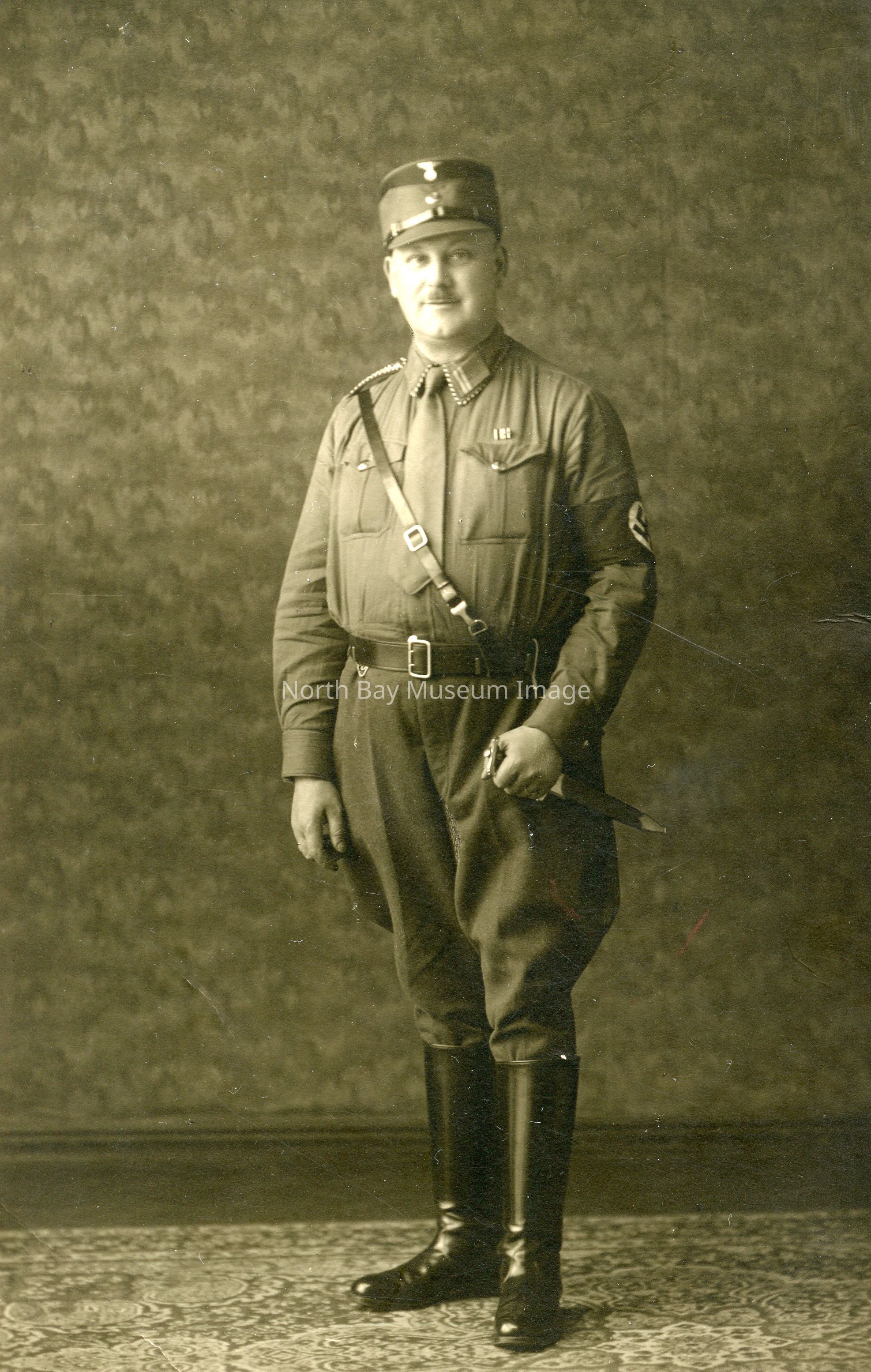 Photograph. Black and white. Shows man in what appears to be a Nazi uniform of some sort. Inscription on back: "The late proprietor... Koffeehouse", "Varel", "Now a saddlehorse man", "H. Wilhelm, Varel i.O.".