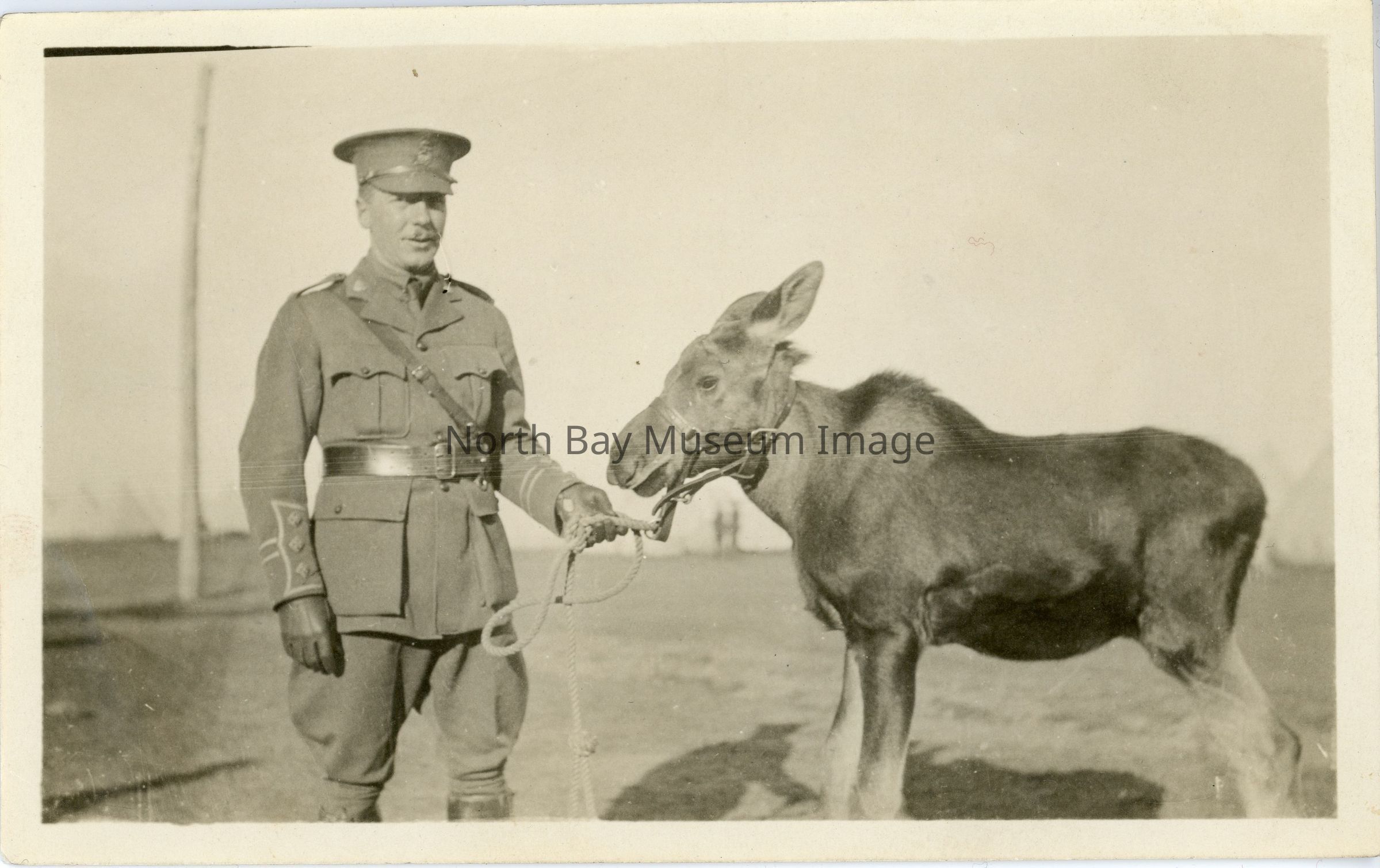 Sepia photograph of Alex Souter standing in front of log cabin.