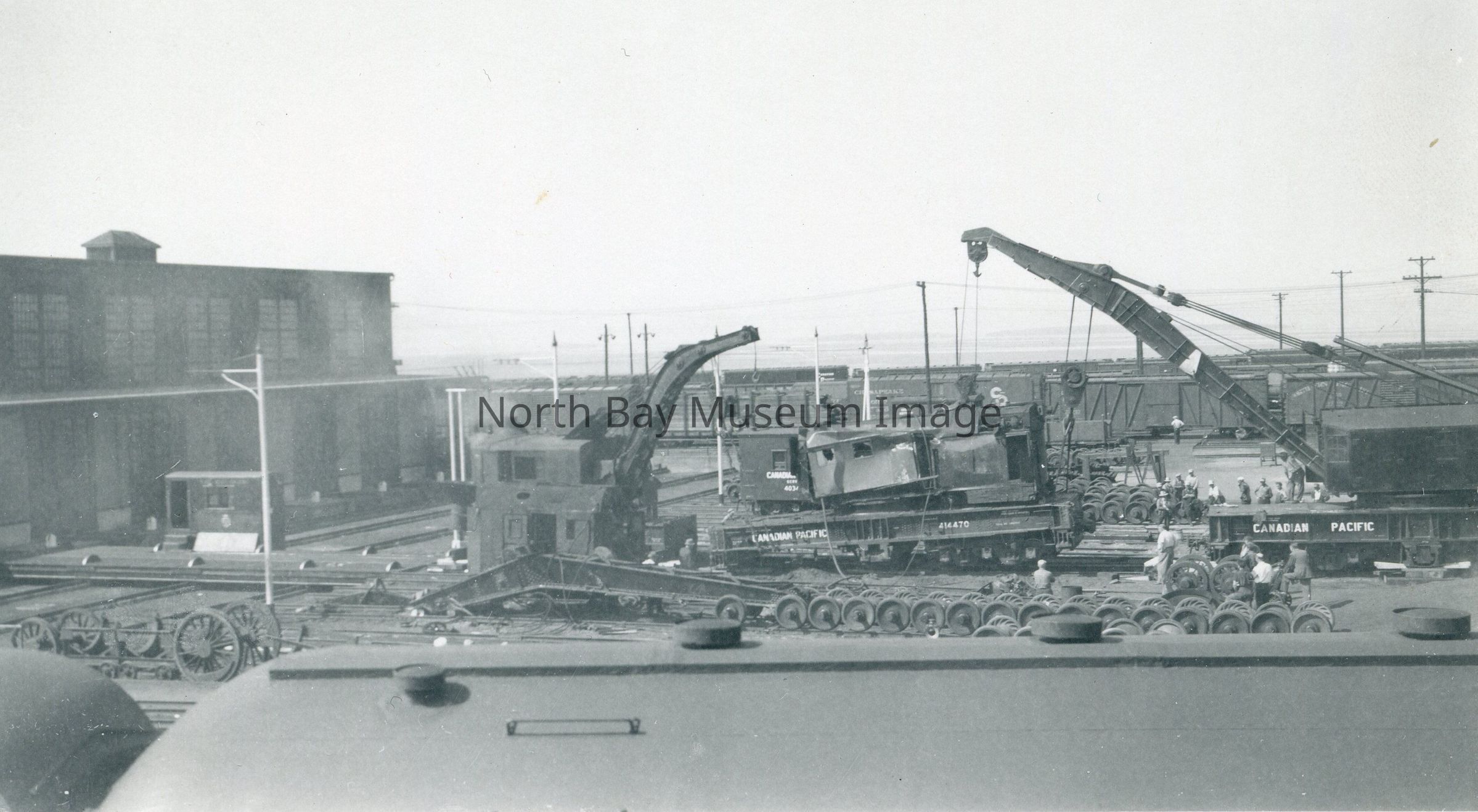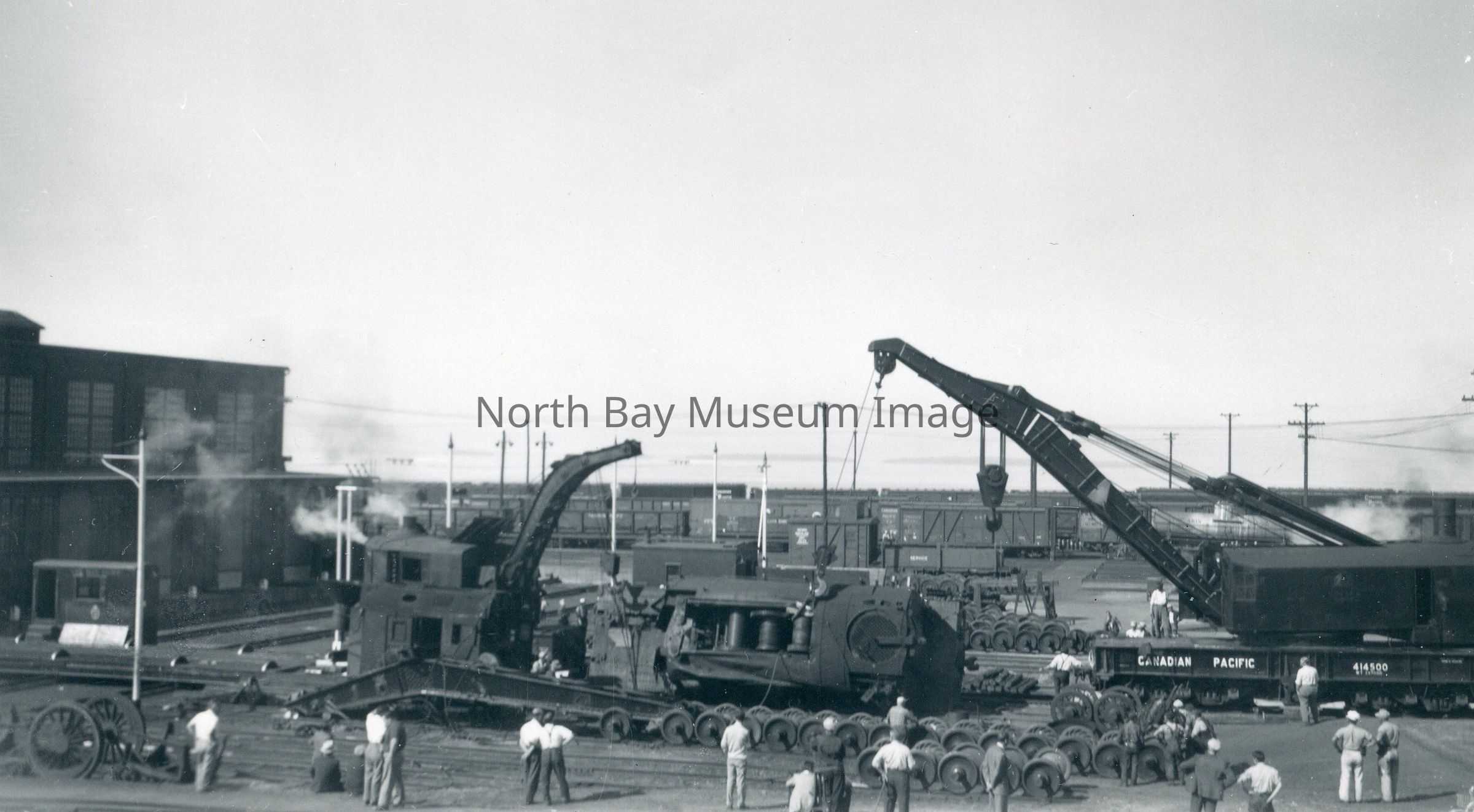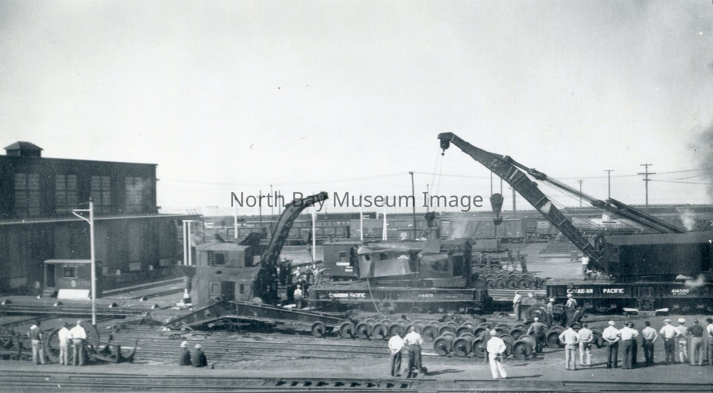 021.13.38 - "View from CPR Station N. Bay. Righting wrecking crane which had turned overacct boom over corner of carwhile lifting off pile driver." "#1 Aug 18 - 51".