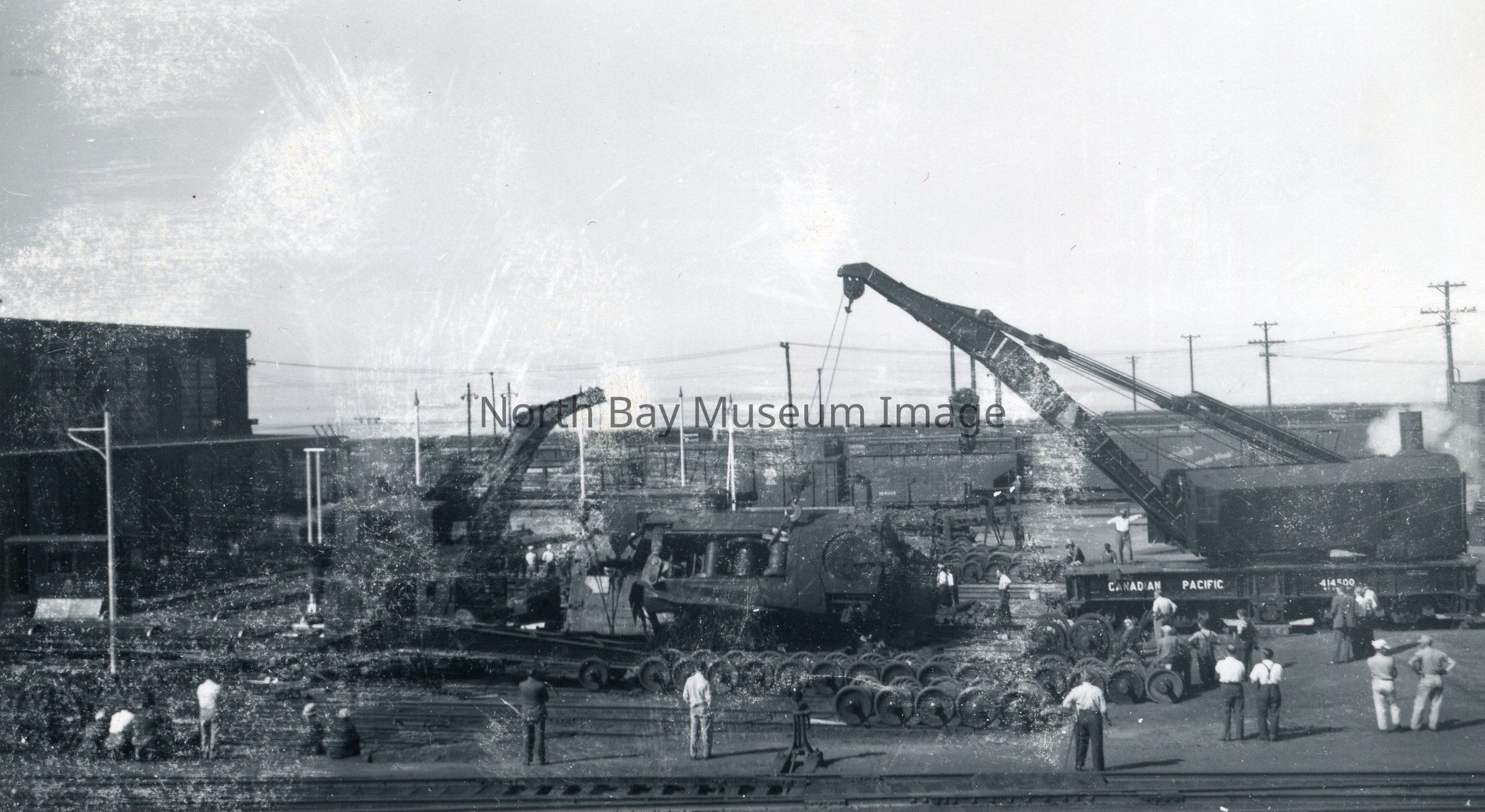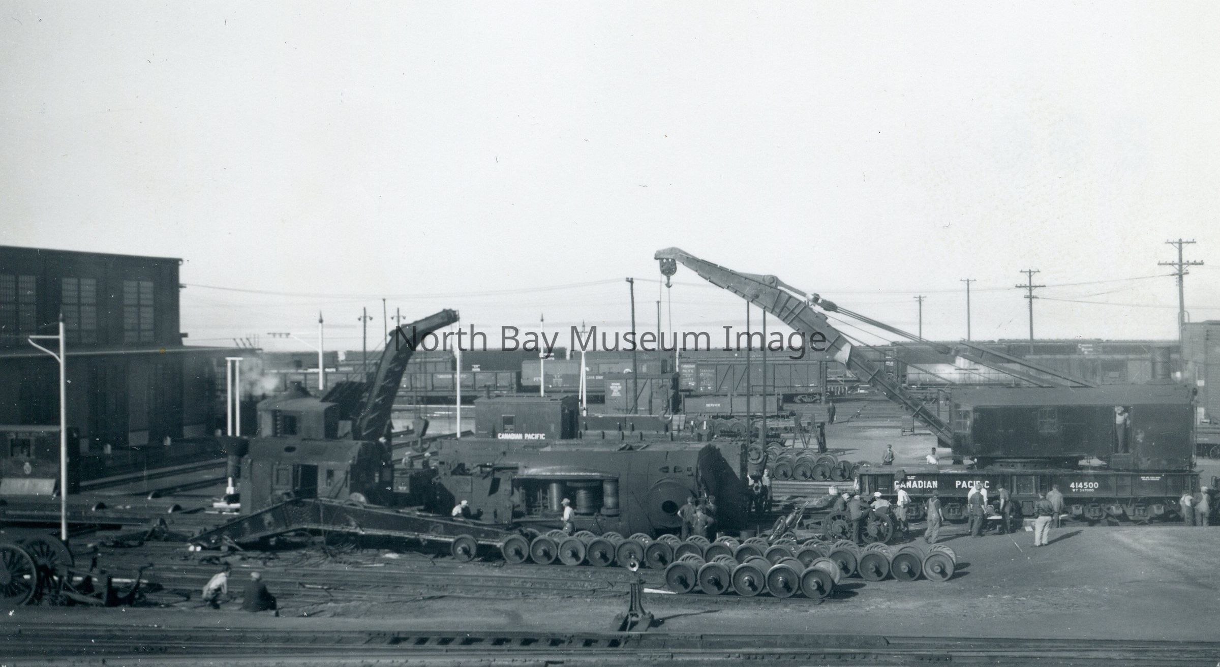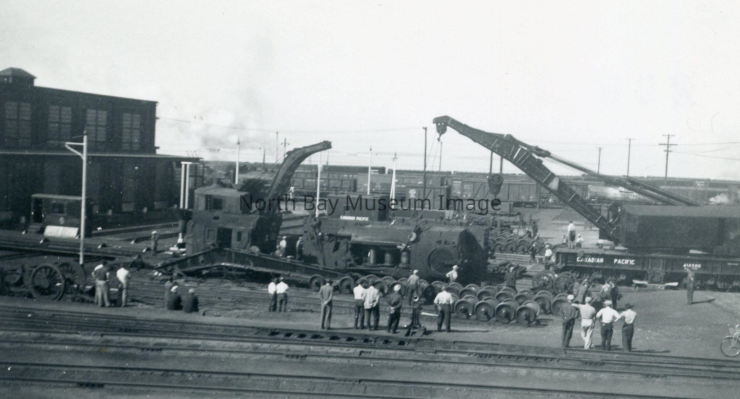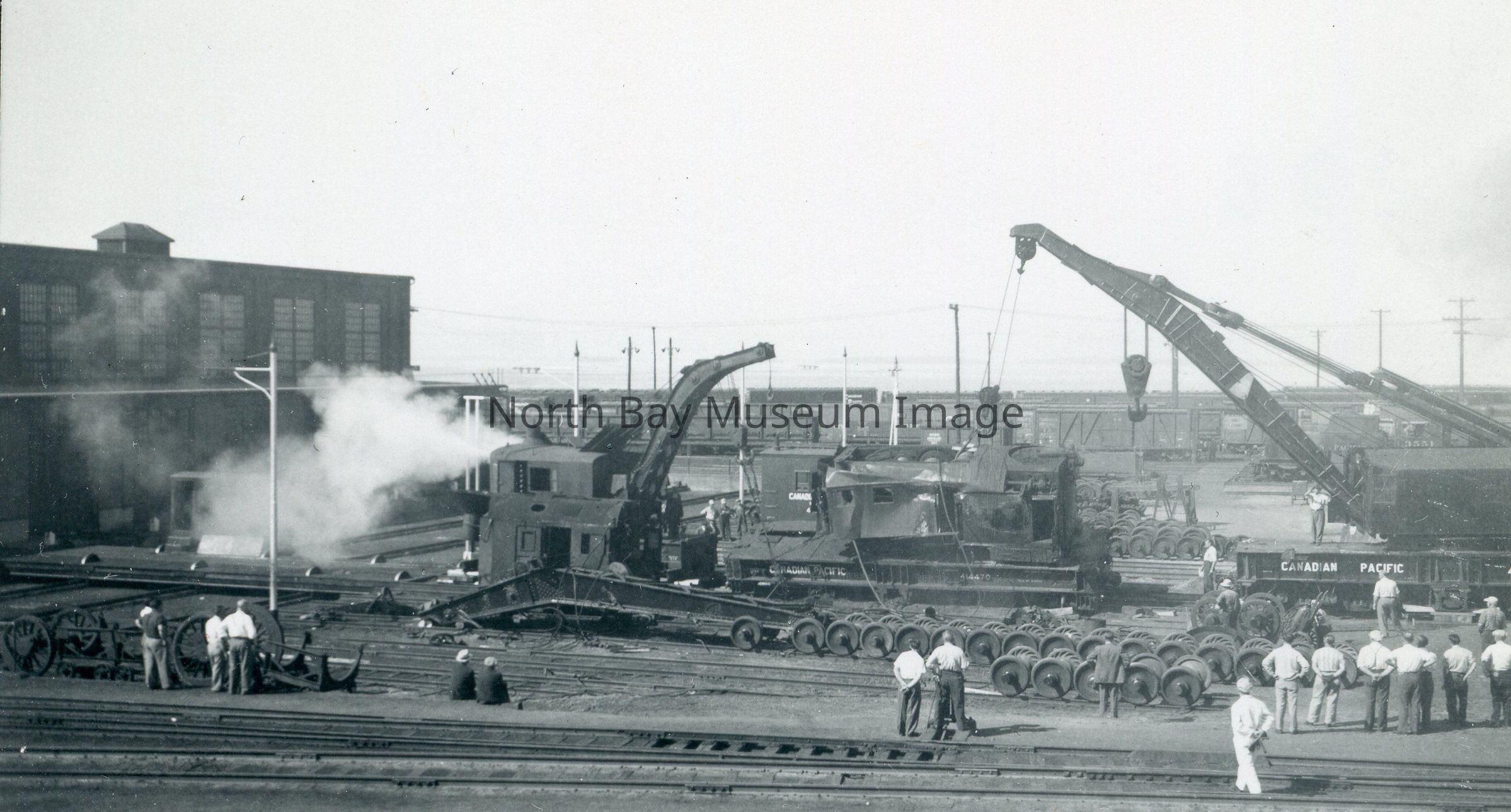 021.13.38 - "View from CPR Station N. Bay. Righting wrecking crane which had turned overacct boom over corner of carwhile lifting off pile driver." "#1 Aug 18 - 51".