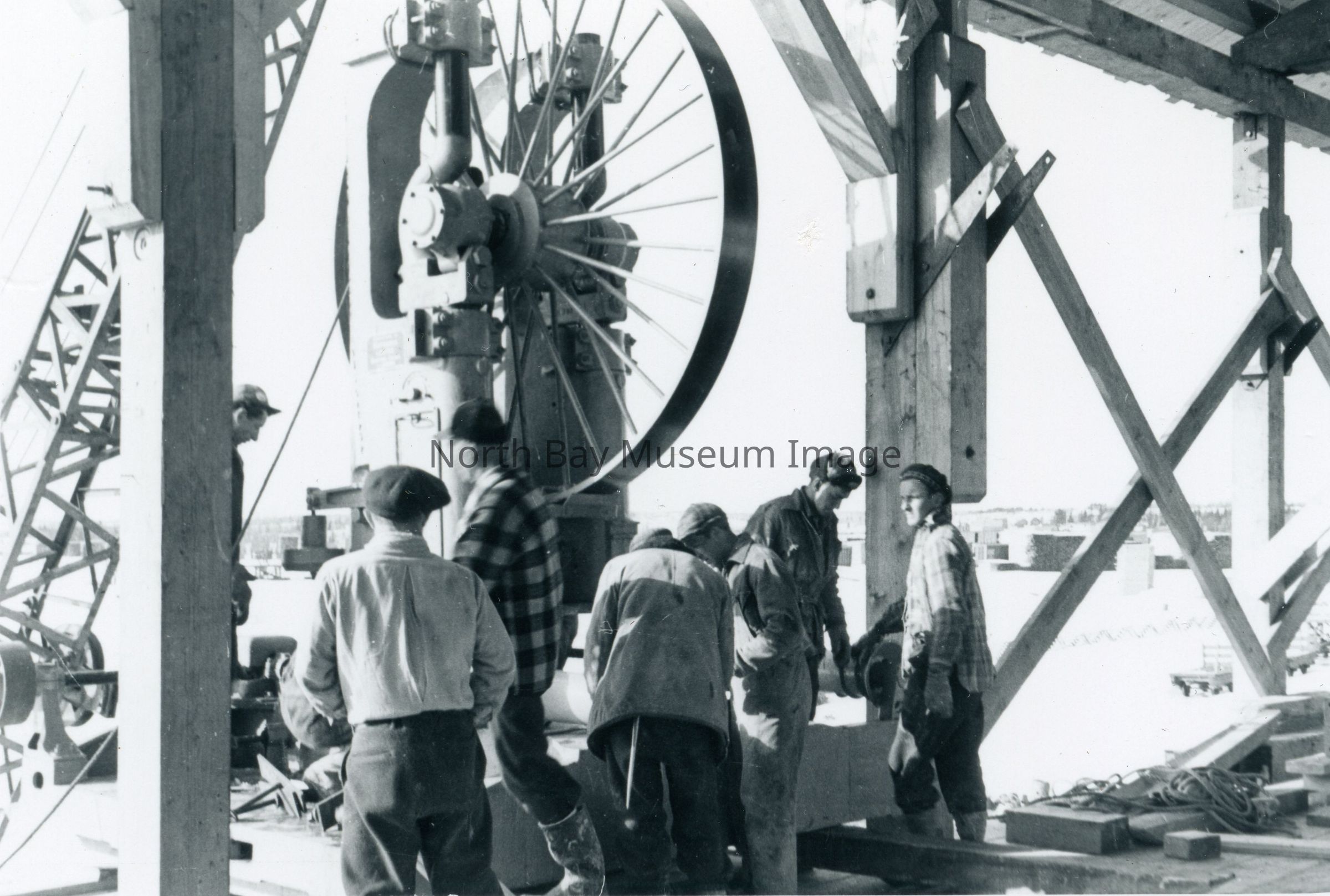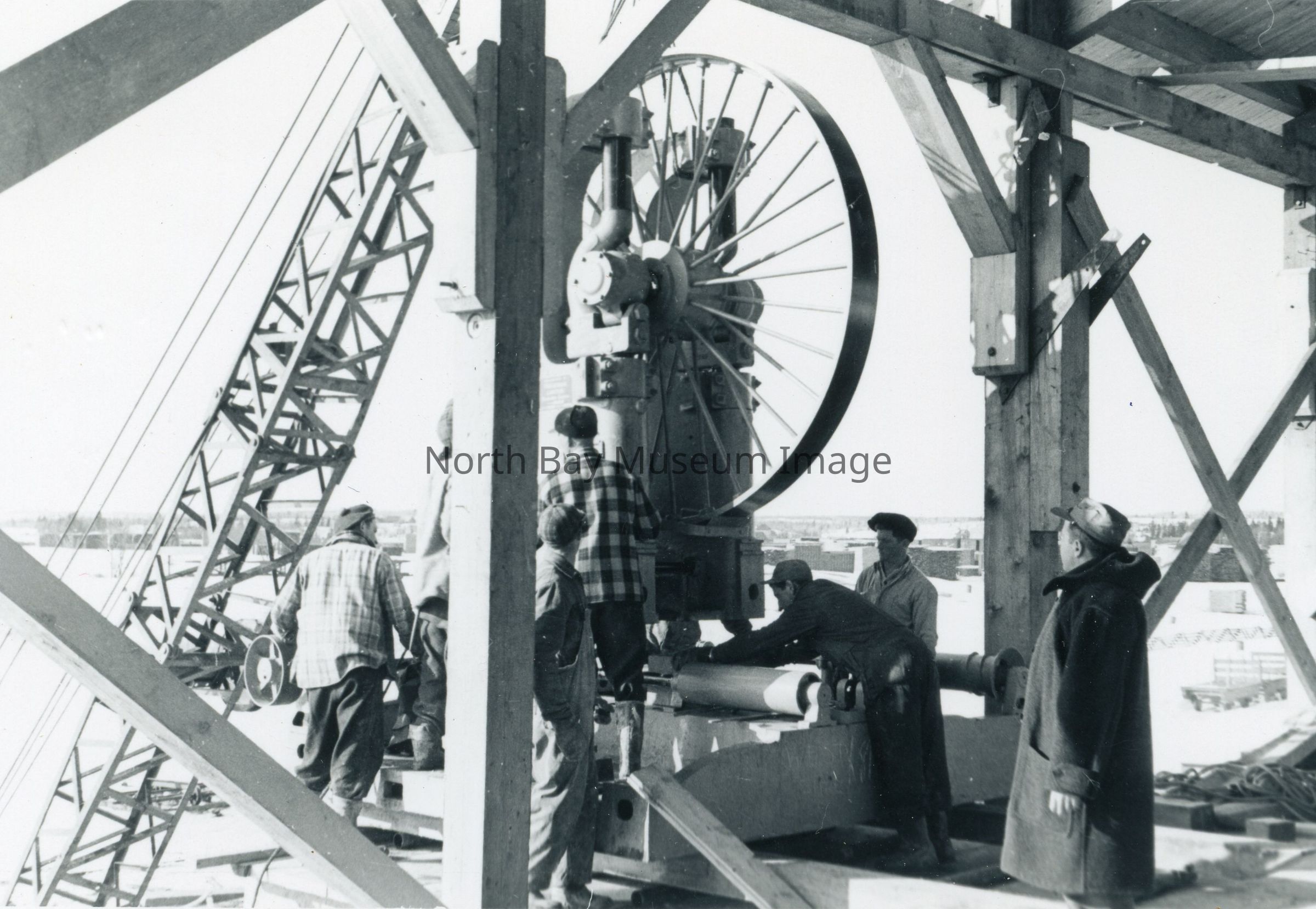 - Picture (b) shows the large piece of machinery being installed. About seven (7) men are seen.