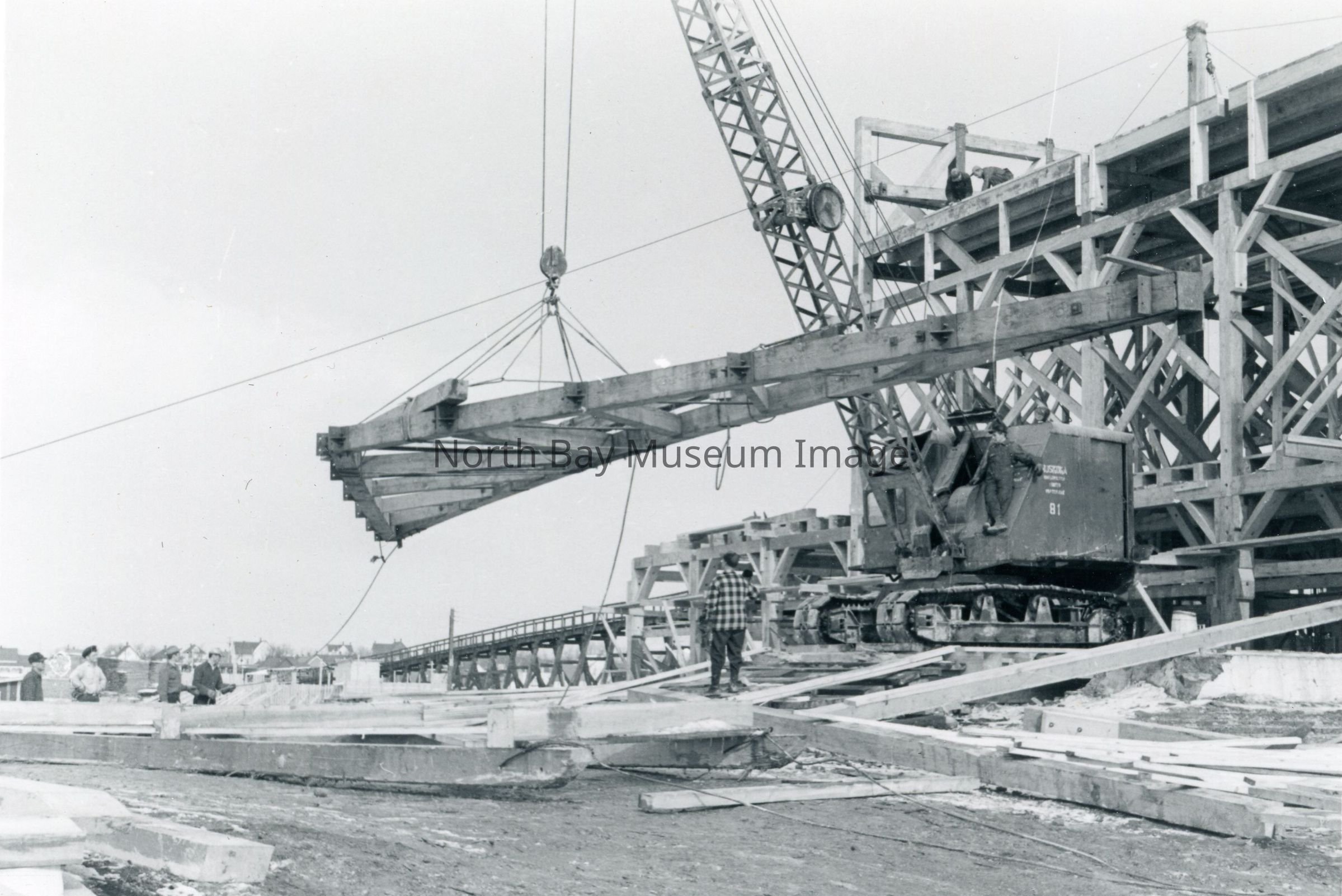 -Crane moving large pieces of a structure. -Nothing written on border. -9 cm x 12.5 cm. -Single picture. -Black and white.