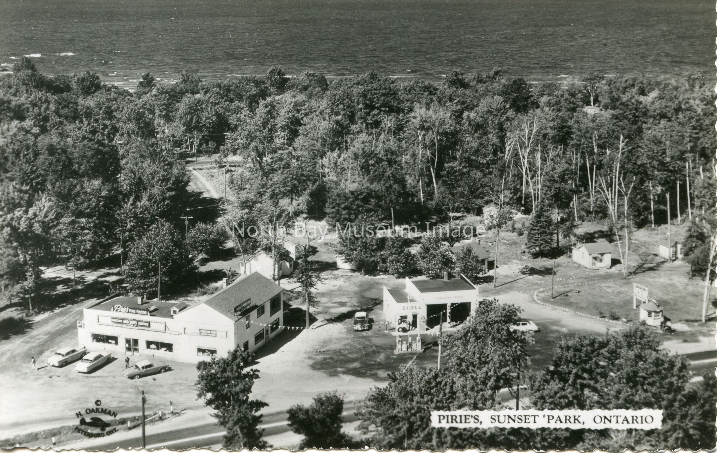 B&W 1960s Oakman aerial view photo of Pirie's grocery store and a Shell service station at Sunset Park in North Bay. Pirie's later became Woody's restaurant, owned by Bob Wood. Churchill's restaurant now occupies the former Pirie's location, at 631 Lakeshore.