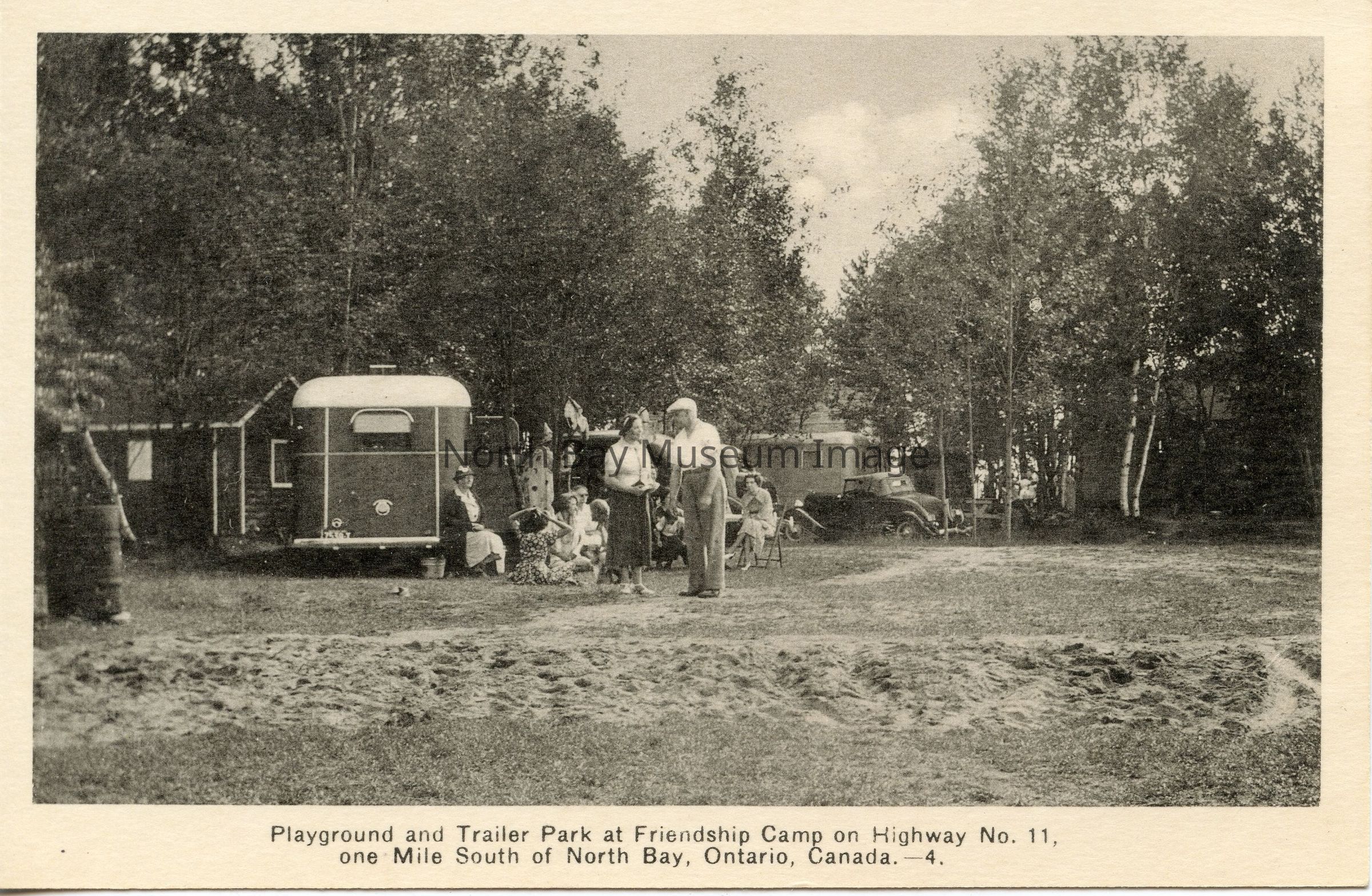 Postcard with B&W photo of trailer park south of North Bay. Small building on left edge of photo. Three small trailers and two cars in picture. A man and a woman stand in centre of photo, with 10-12 adults and children sitting on chairs or on the ground behind them.