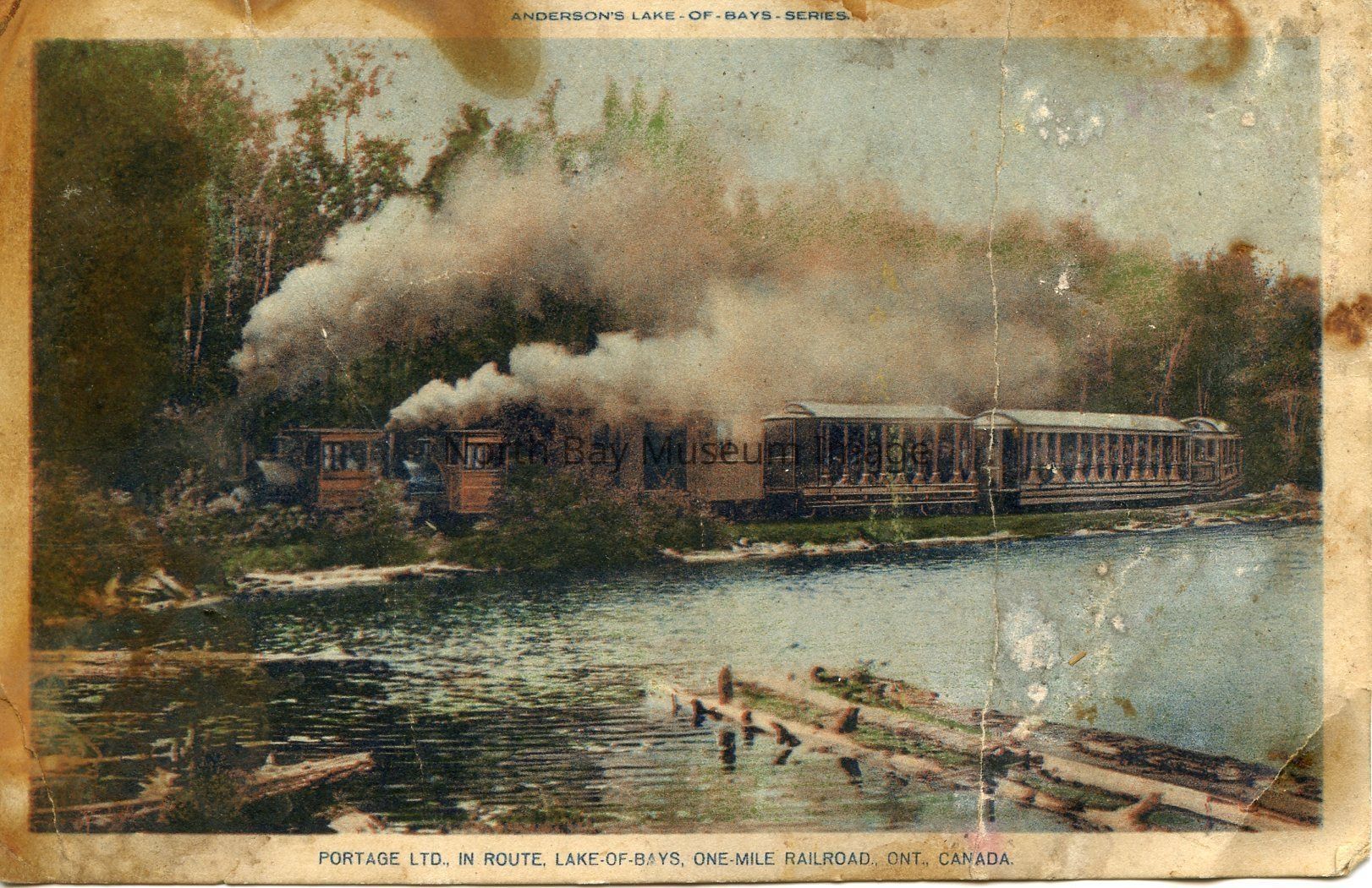 This is coloured postcard. It is a part of "Anderson's Lake of Bays Series." The image is of a yellow train running along side a lake. There is multiple dark, deep smoke clouds from the trains exhaust.