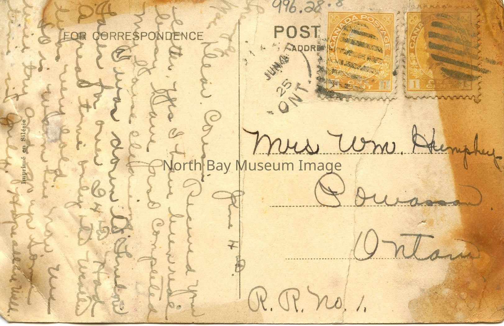 On the back of the postcard, it is addressed to Mrs Wm. Humphrey, Powassan, On RR No 1. The message says, "Dear cousin'', and talks about weather and a trip to Fenelon Falls. This postcard has two 1 cent stamps. It was postmarked Jun. 4, 1925.