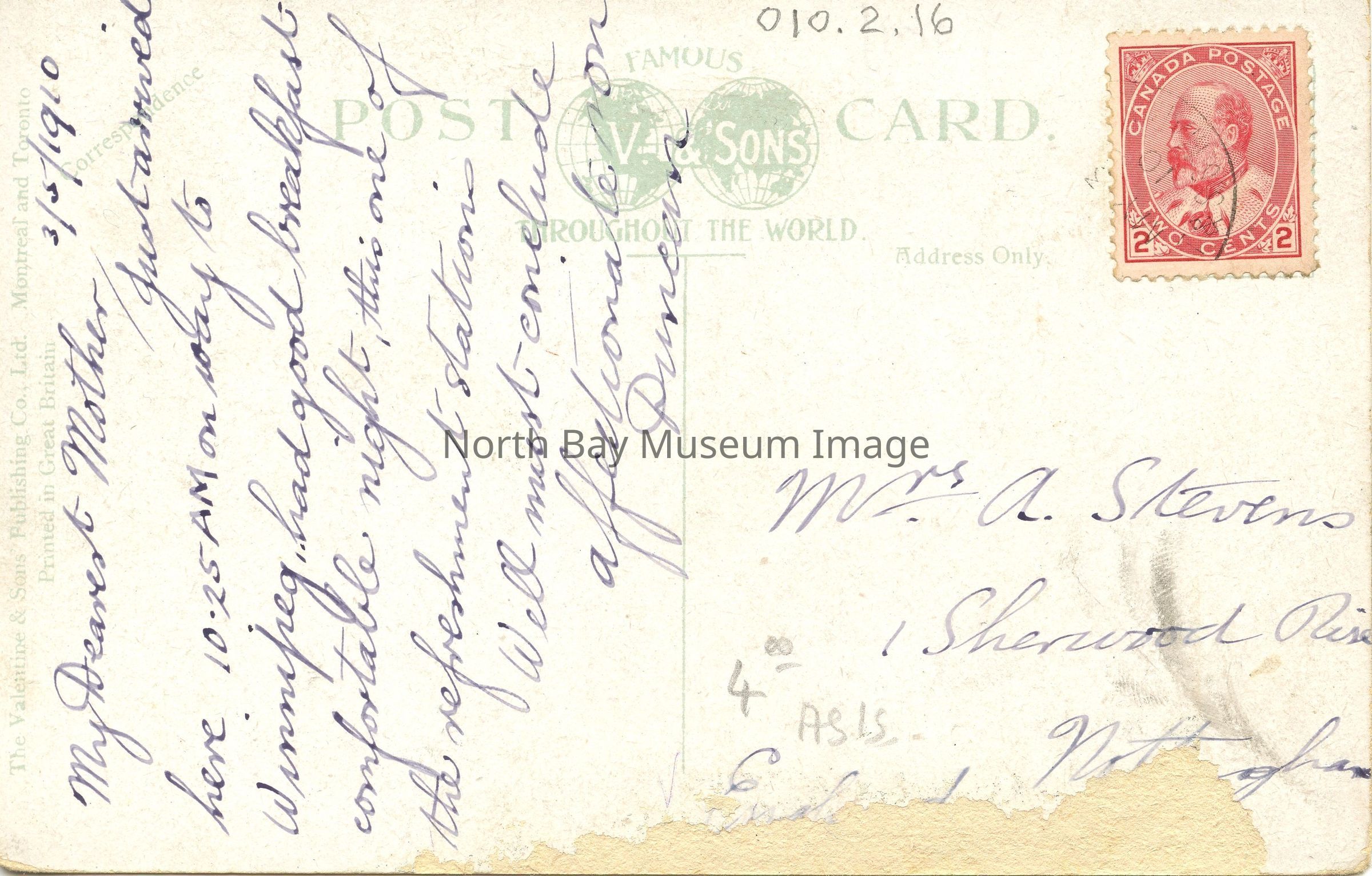 -- Addressed to: Mrs. A. Stevens, 1 Sherwood (edge of card cut off), (Bottom edge of card torn) NottinghamCreator