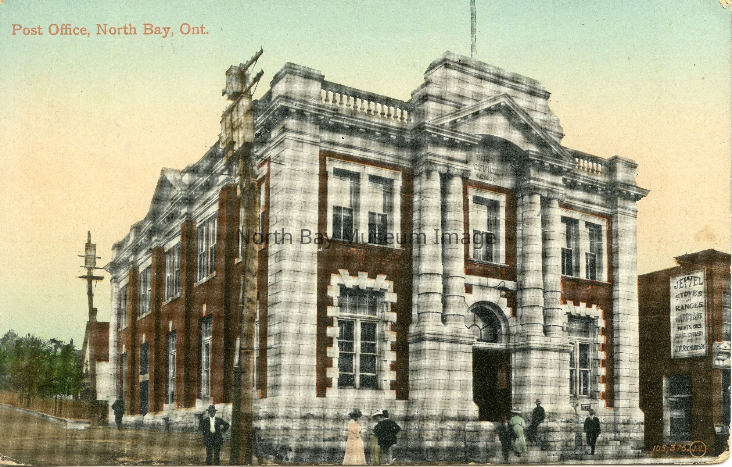 Front of postcard has (color photo) of North Bay Federal Post Office building, located at Main St. West and Fraser, NE corner, later replaced by Kresge store after being torn down.
