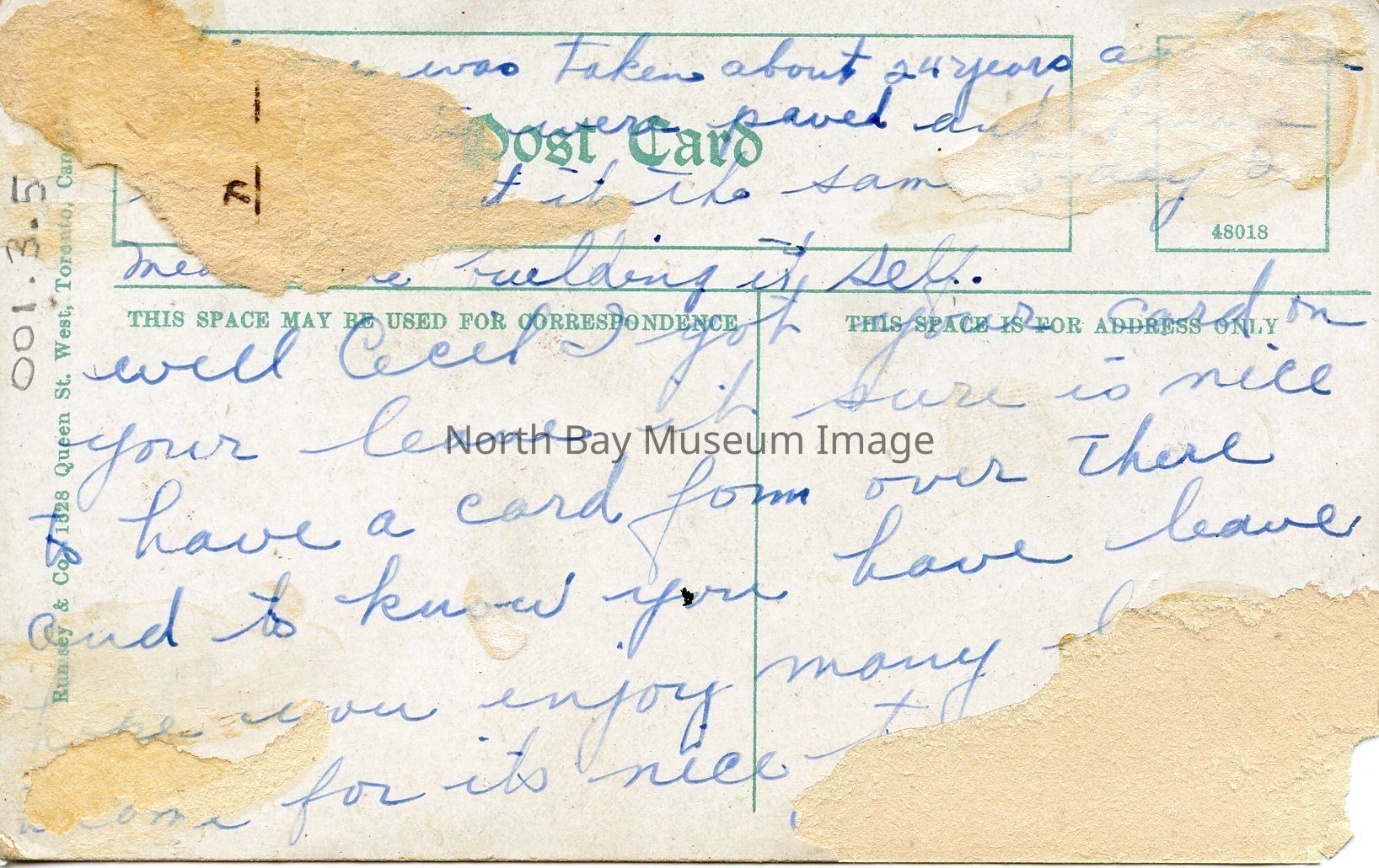 There is a message written in blue ink on the back of card. Much of the message is lost as there has been paper added or removed from the card.Creator