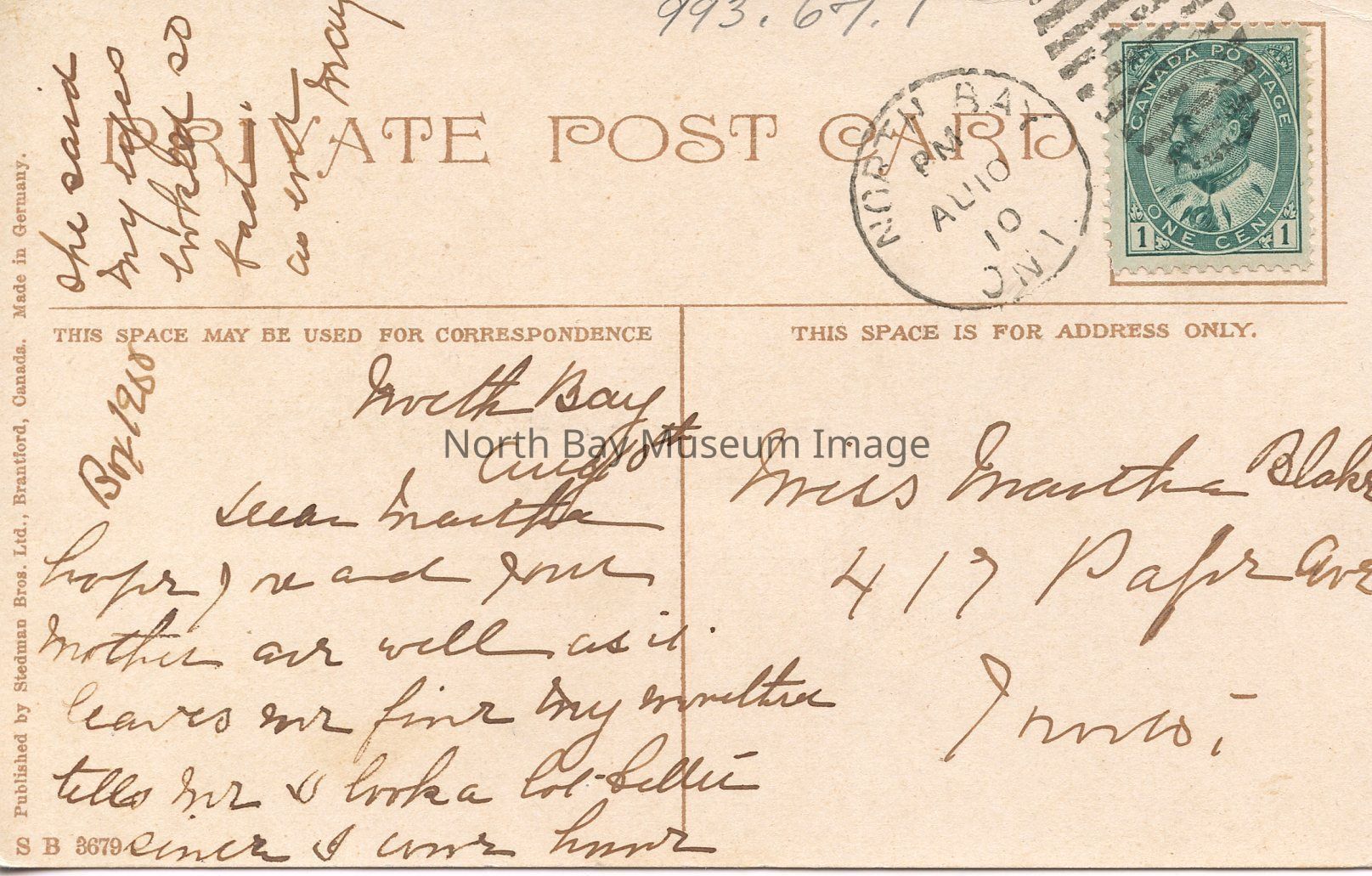 On the back of the postcard is a handwritten message in black ink. The postcard is dated Aug. 10,10. There is a 1 cent stamp with the image of either Edward VII or George V on it. This postcard is addressed to the 2nd donor Ms. Susan Law, 298 Jarvis St. Apt.#901, Toronto.