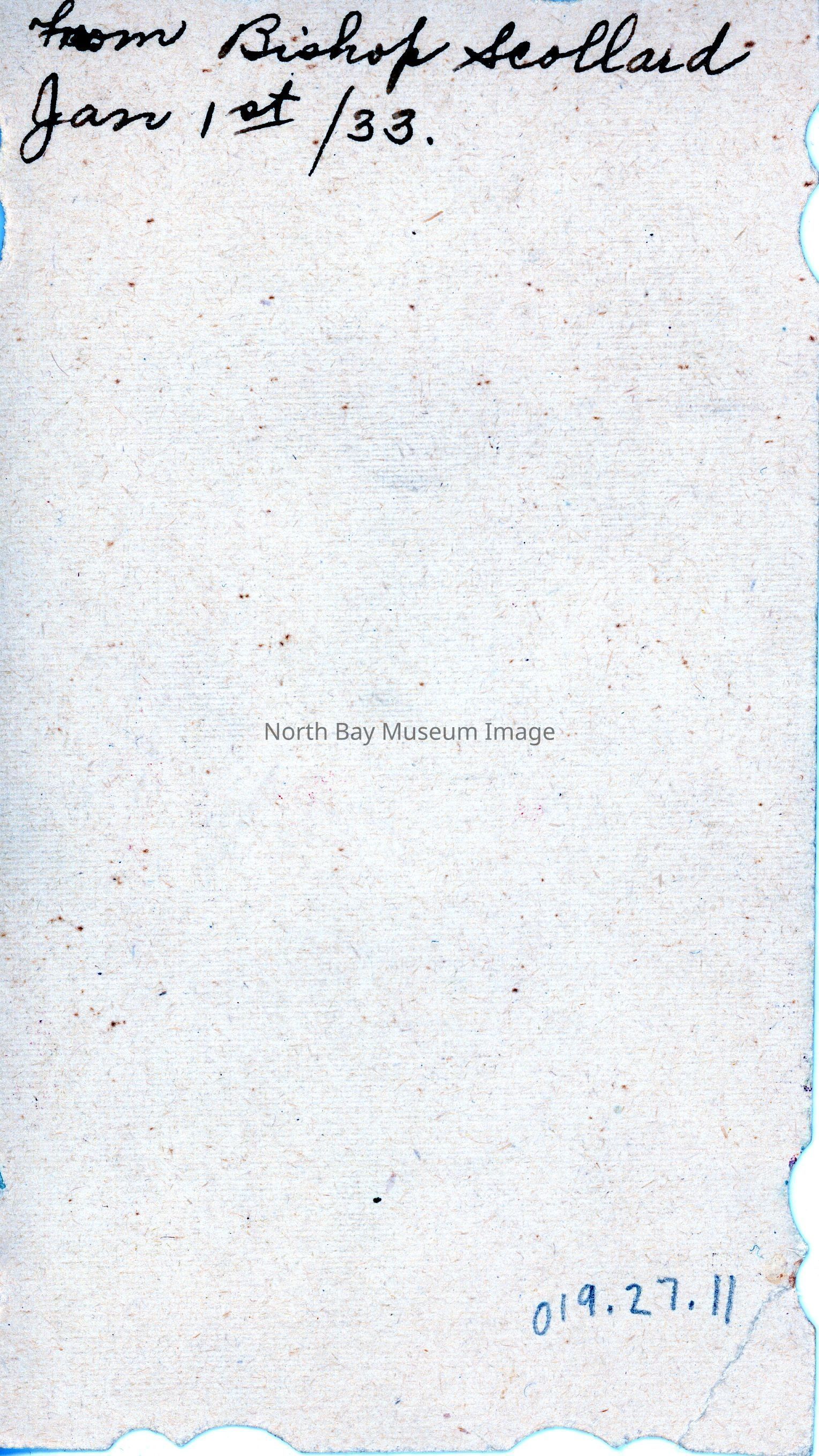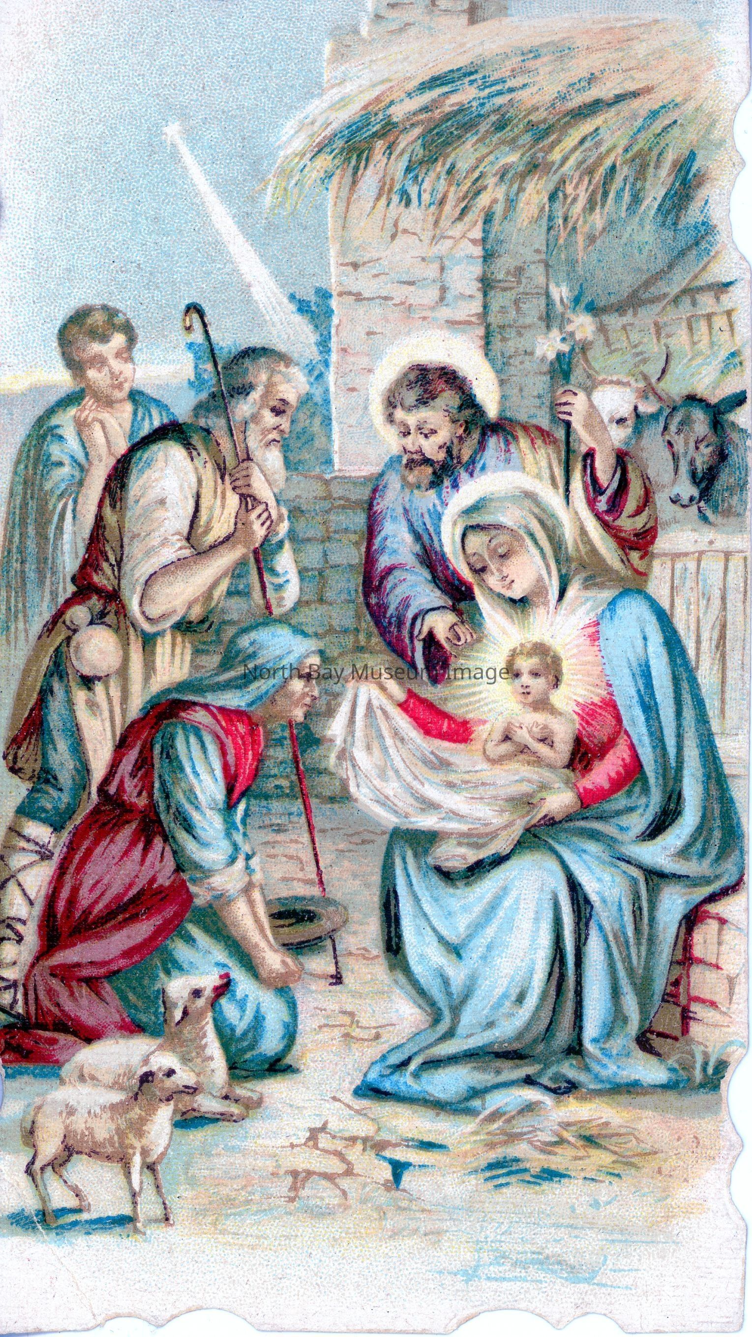 Manger scene on one side of a card, on reverse is printed in pencil "from Bishop Scollard, Jan 1st/33"