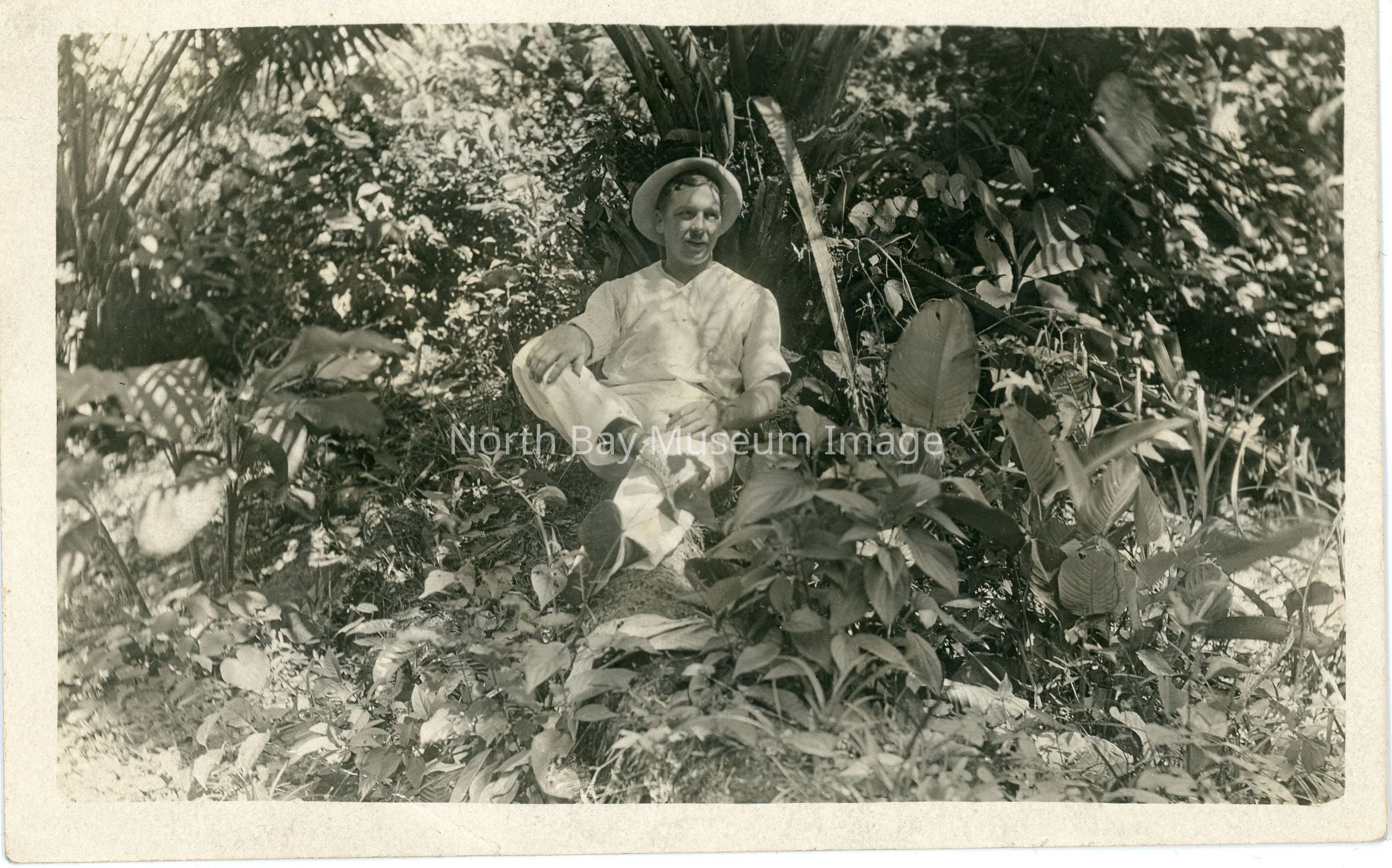 Blank sepia postcard with man on front in foliage, likely of A.C. Souter's friend.
