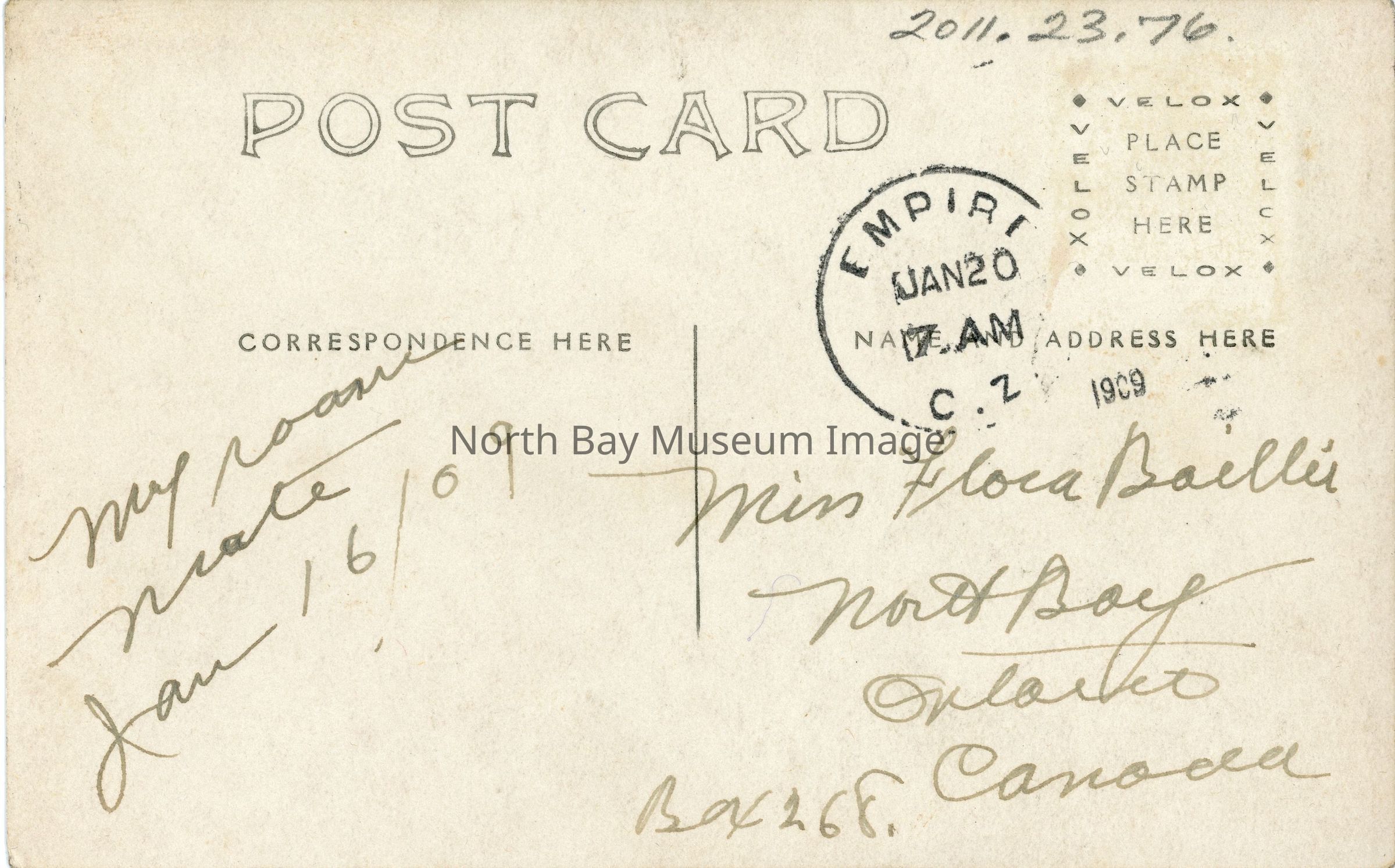 Photo of young man in front of palm tree on front with message on back "My roommate Jan 16/09" addressed to Miss Flora Baillie, North Bay Ontario Box 628, Canada" sent from A.C. Souter. Green panama stamp.