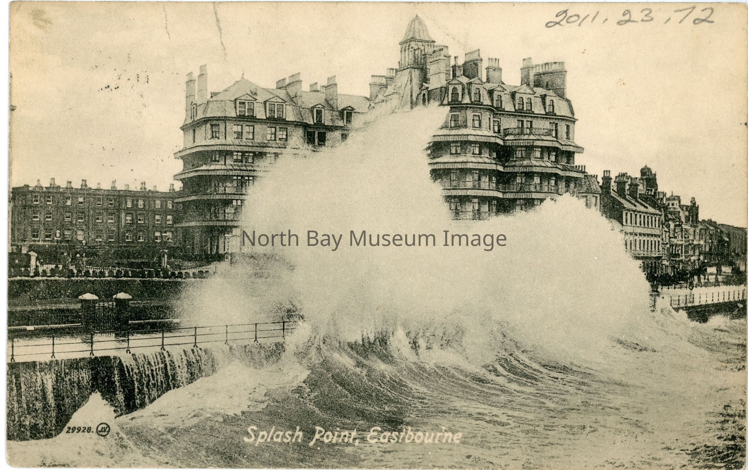 Sepia postcard addressed to Master George Souter Box 268, North Bay with message "How is Daddy's boy? It's a long time since I had a letter from you young man. Get mamma to help you write a letter to daddy" Front of postcard depicts waves splashing against large building at Splash Point, Eastbourne"