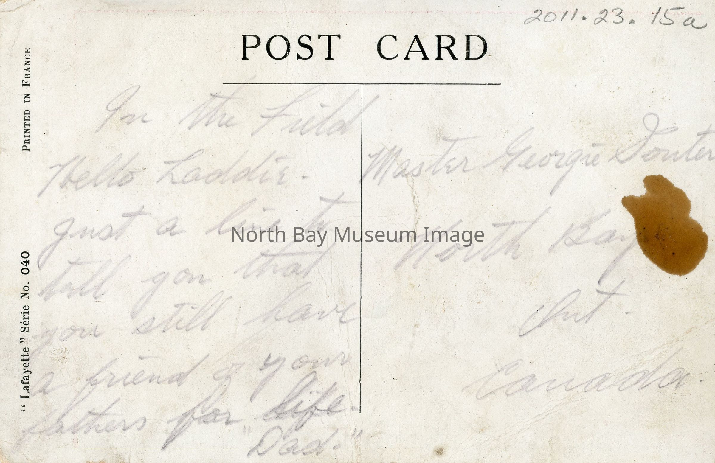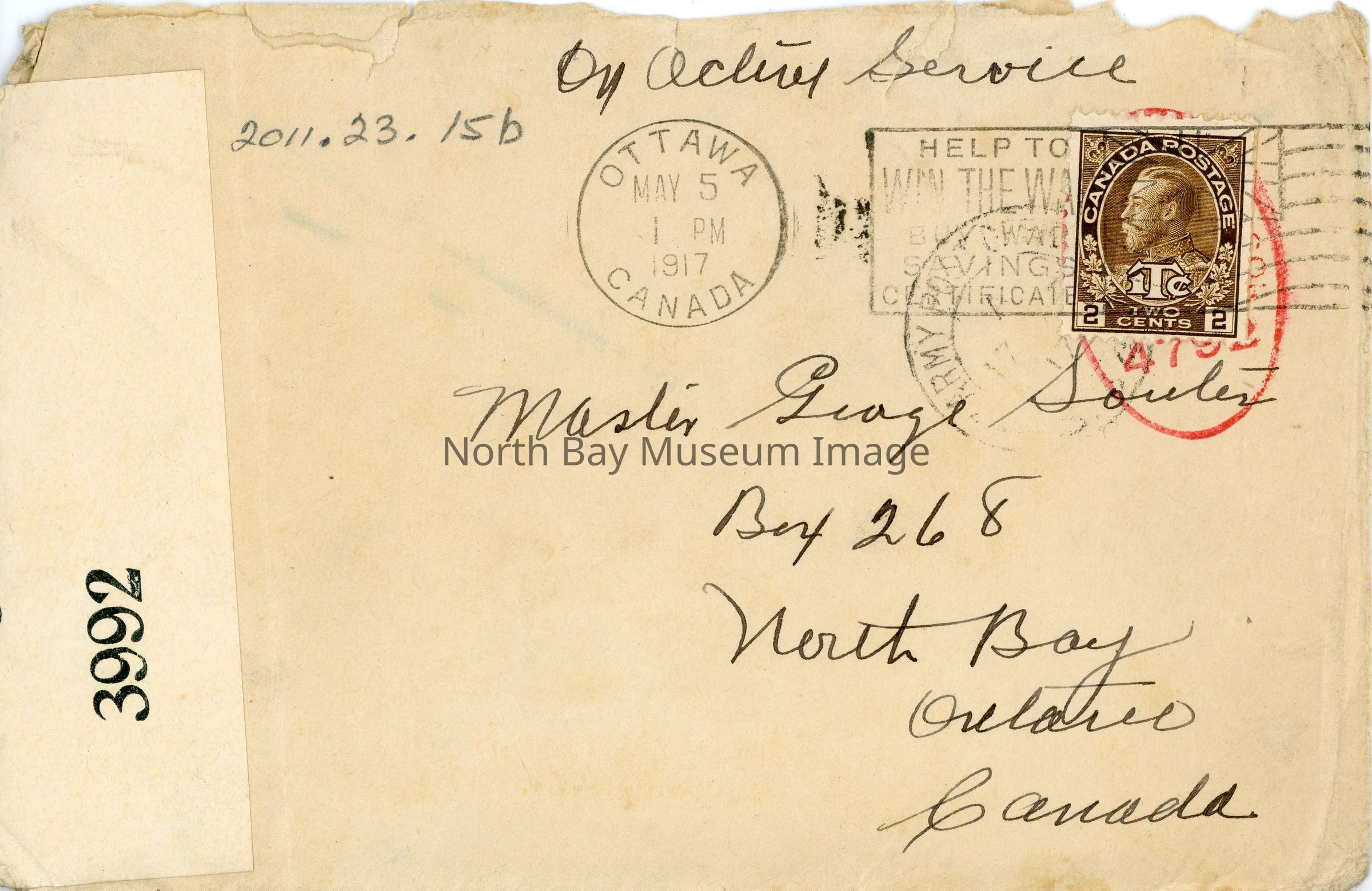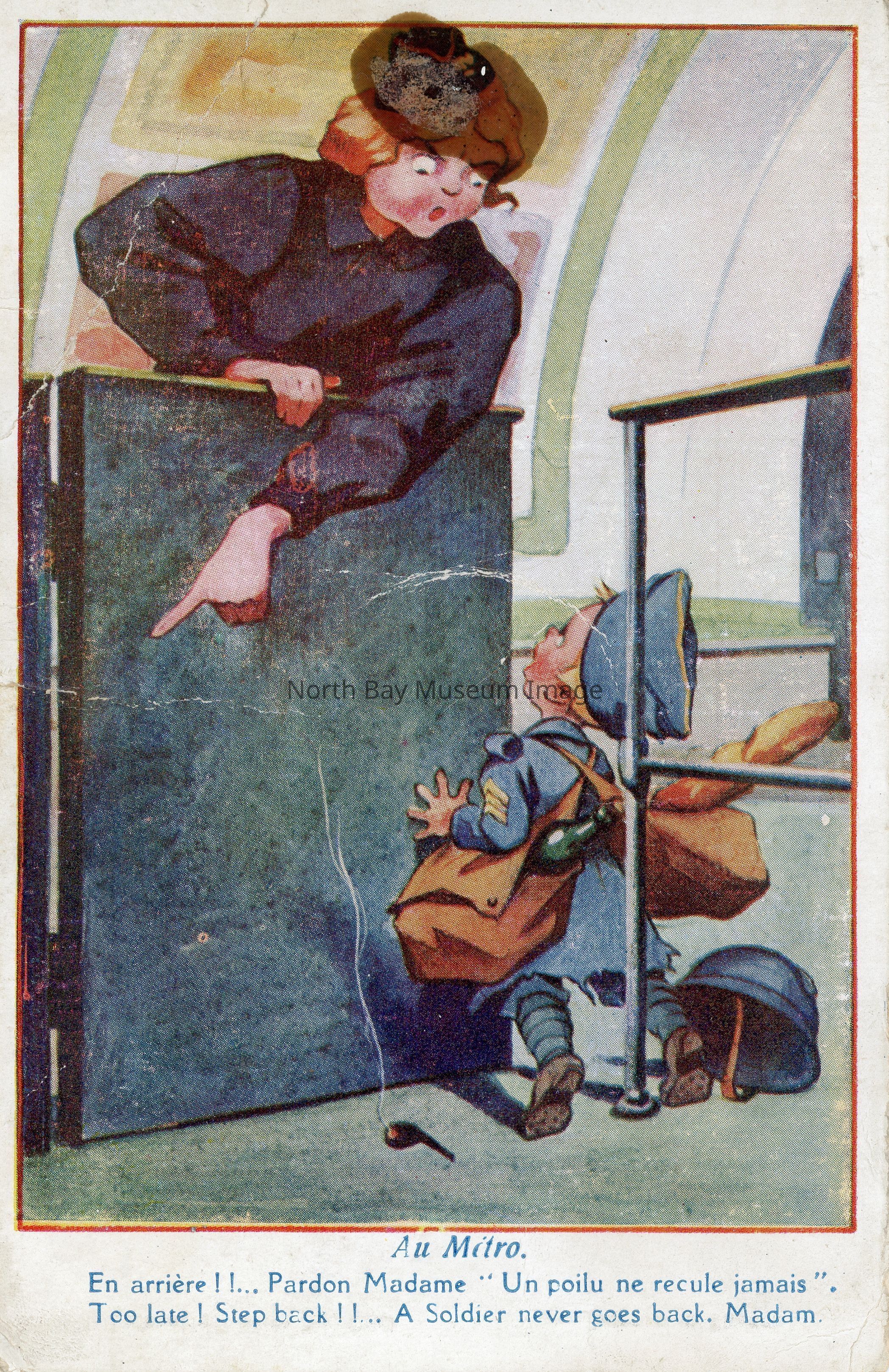 A- Postcard written to Master George Souter North Bay, ON from "Dad" on front colour photo of woman pointing toa tiny soldier. Caption in English and French "Too Late! Step Back! A soldier never goes back, Madam." B- Envelope for postcard addressed to Master George Souter, Box 268 North Bay Ontario Canada. Posted from Ottawa May 5, 1pm 1917.