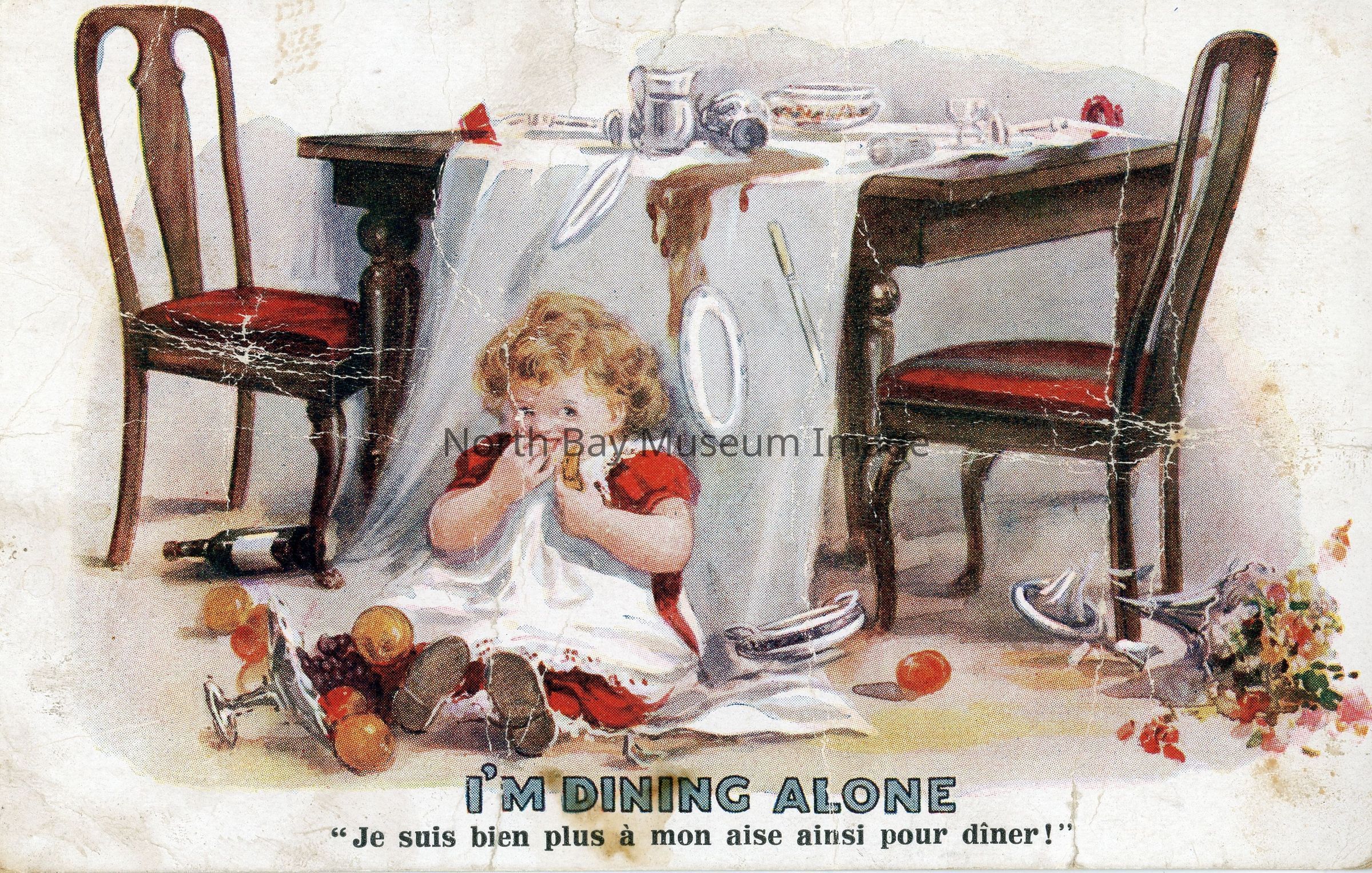 A- Postcard written to Master George Souter North Bay, ON from "Dad" (Alex Souter) on front caption "I'm Dining Alone" in English and French and picture of small girl eating while sitting on the floor.