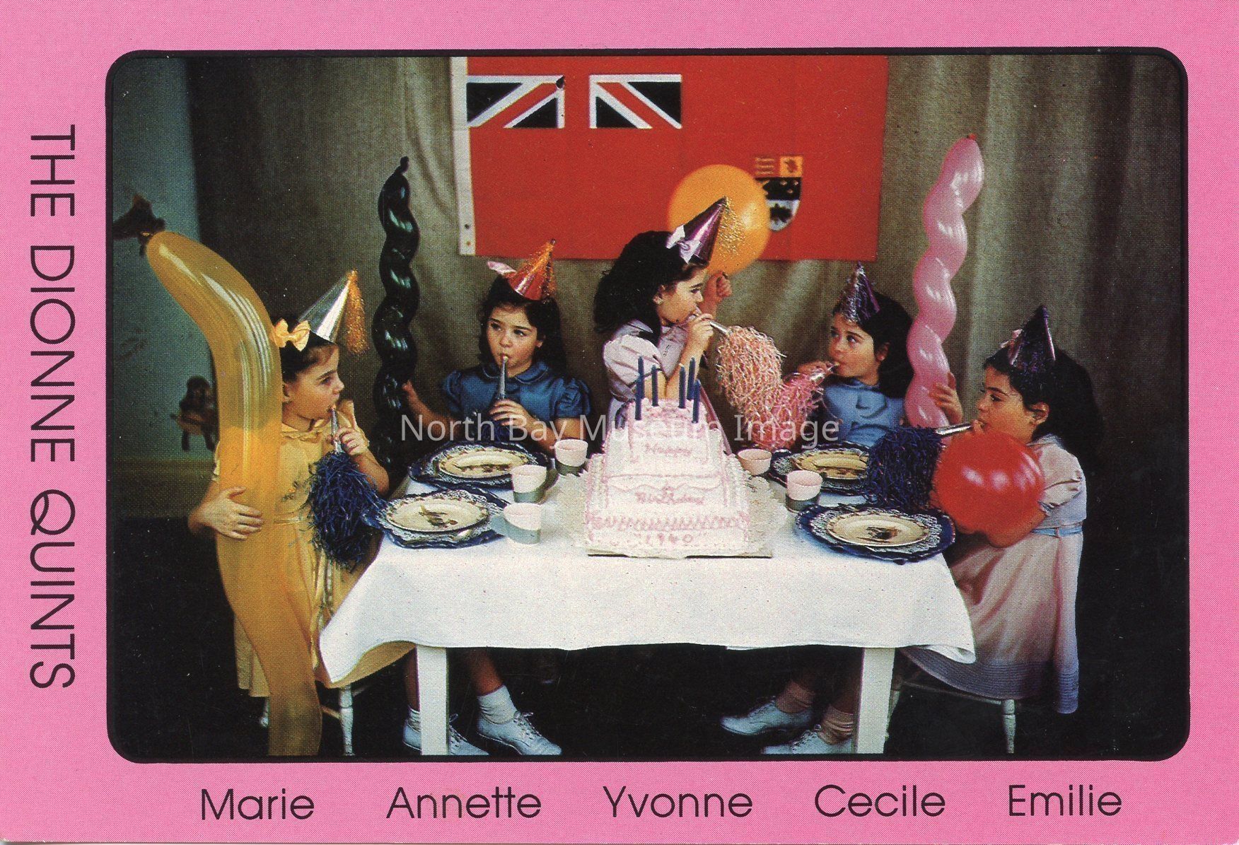 This is a collection of coloured postcards of the Dionne Quintuplets. Both postcards are copies of the same postcard. Printed on the postcards is the words 'The World Famous Dionne Quintuplets.' The postcard captures a scene from their 6th birthday. The card has a pink border around the edge of card. This postcard was published by William R. Forder Souveneirs.
