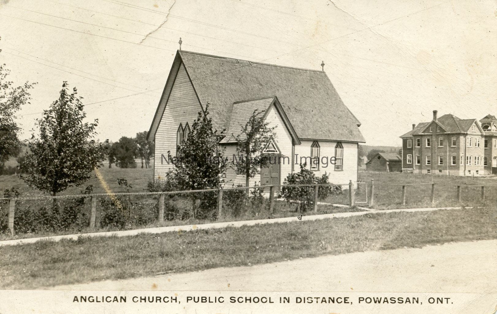 This is a black and white postcard. The front of the postcard has a photograph on it of the Anglican Church. The church is a white building that is hidden behind a tree. There is a fence in front of the church. The public school can be seen in the in the distance. The church and public school are located in Powassan, On.