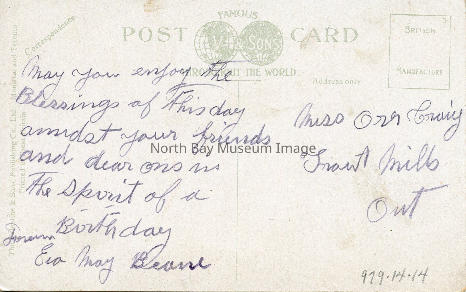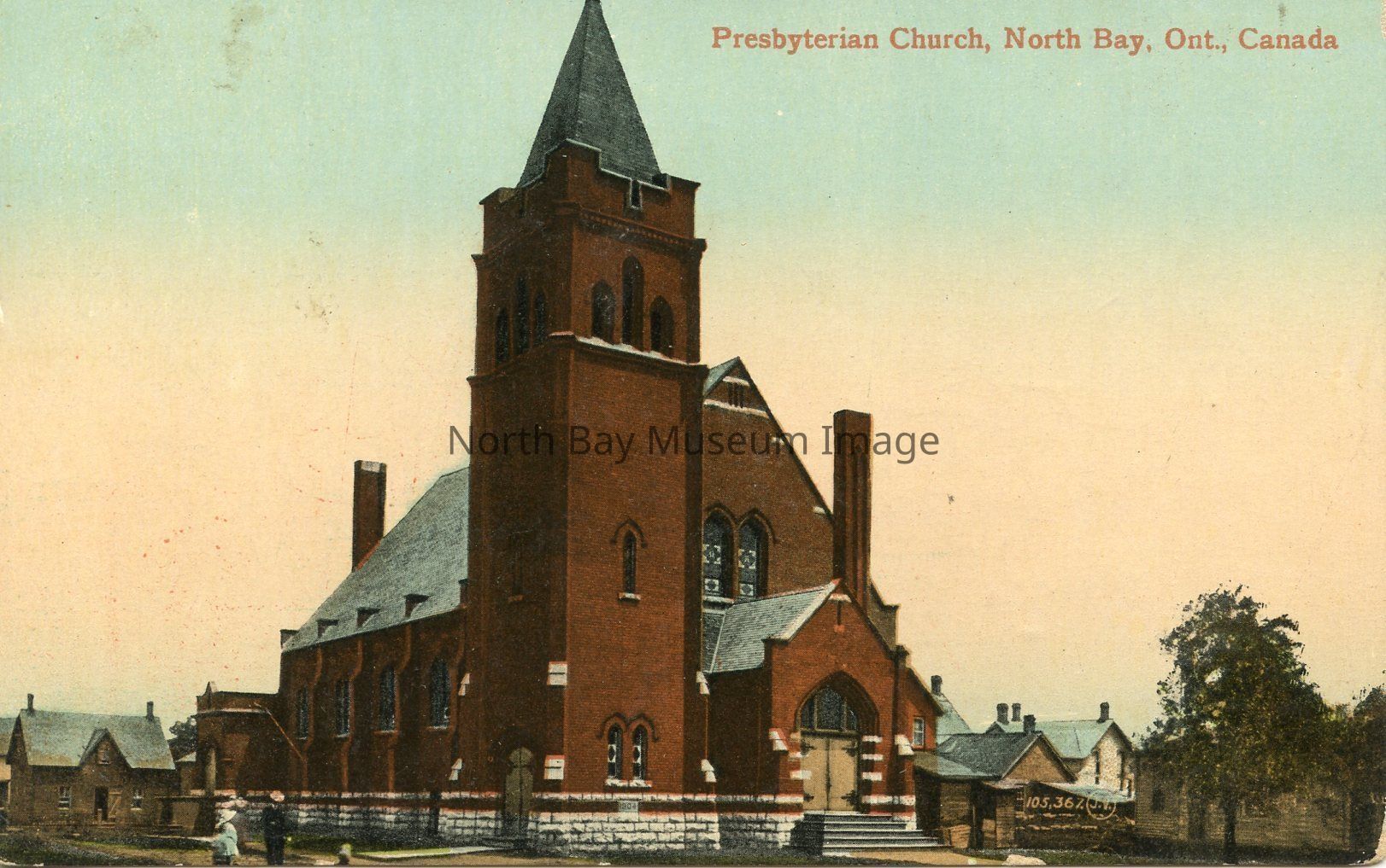 This is a coloured Postcard of the Presbyterian Church in North Bay. The image is taken far back looking at the church. The steeple is clearly seen. The church is a red brick building. There was a bell tower at the top of the Steeple. There appeared to be no buildings around the church.