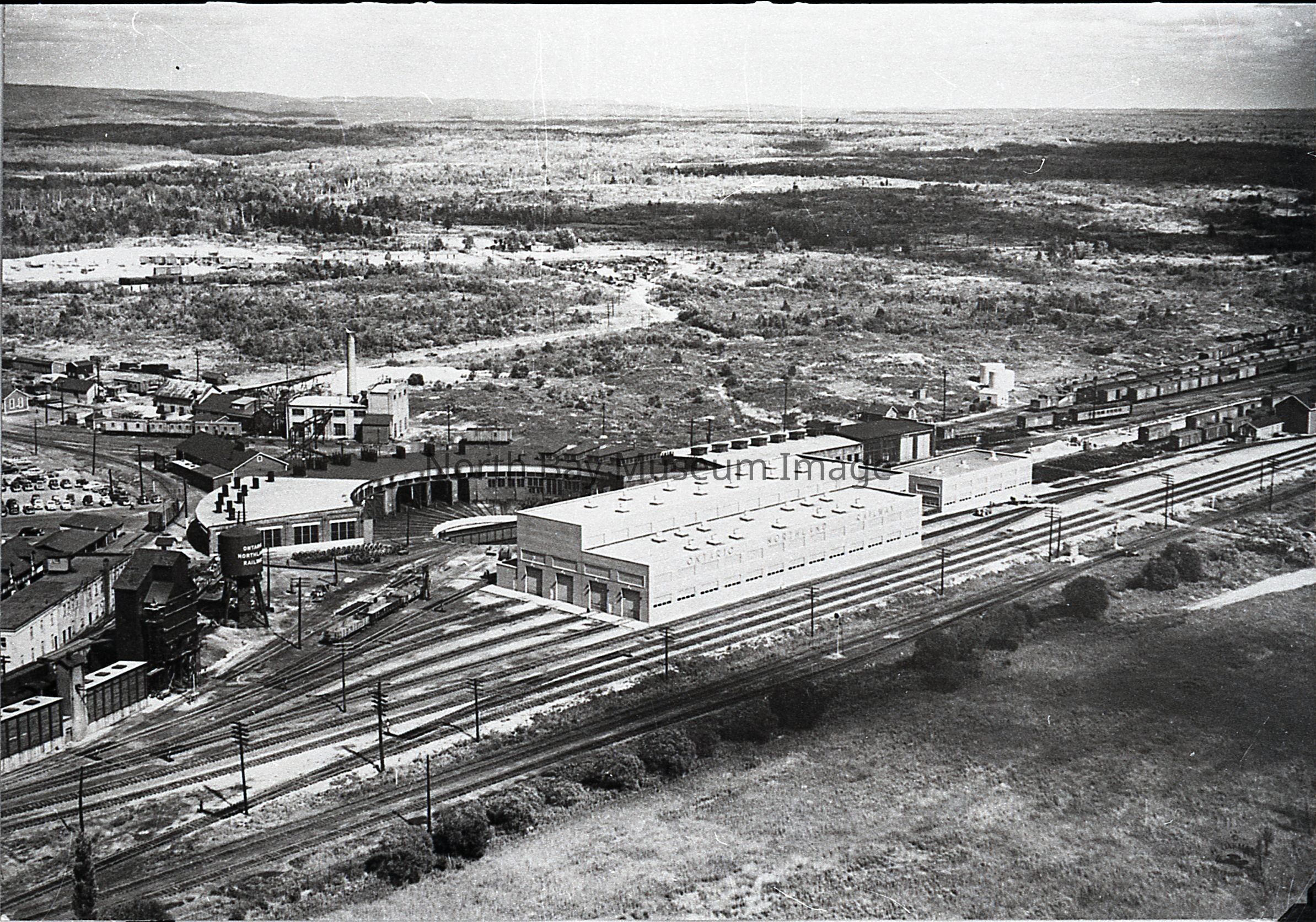 019.60.412c - Paper. Inscription: "Ontario Northland Railway Yards showing turntable, roundhouse... diesel shops, North Bay, Ont. CP 1952".Creator