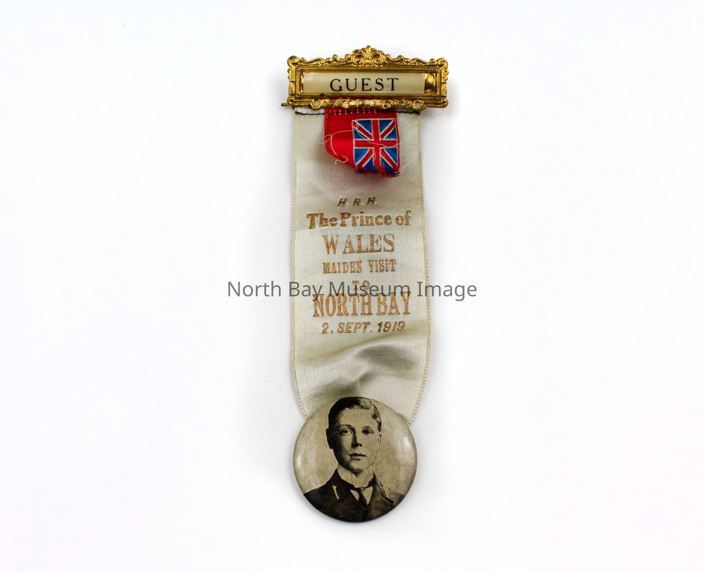 Ribbon and photo issued to some people in North Bay attending a reception for the Prince of Wales: "Guest - H.R.H. The Prince of Wales Maiden visit to North Bay 2 Sept 1919"