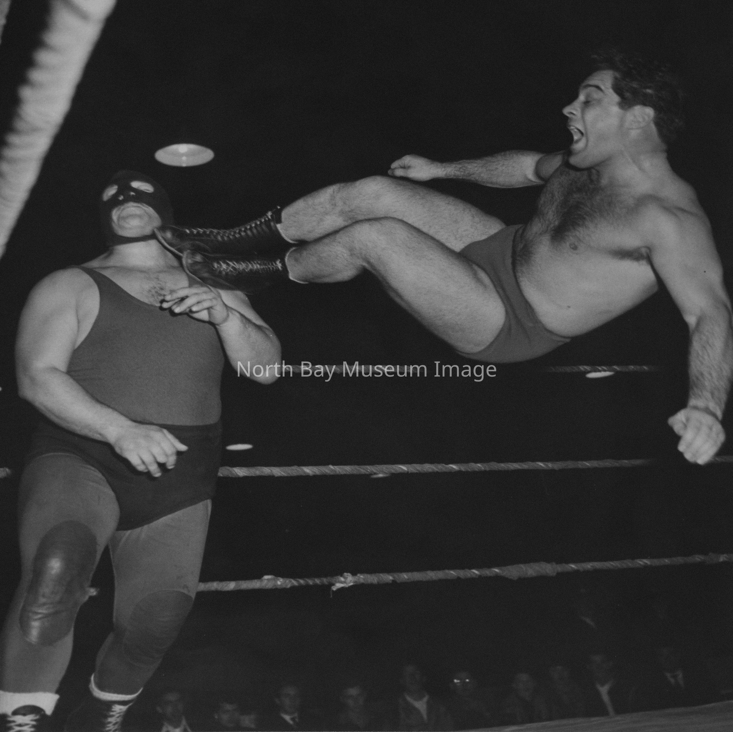 Print is a black and white photograph, taken from the ringside of a pro-wrestling match held at Memorial Gardens, c. 1950's. The leaping wrestler is landing a kick in the neck of a masked wrestler as the crowd looks on. The leaping wrestler is believed to be a crowd favourite, Larry Kasabowski