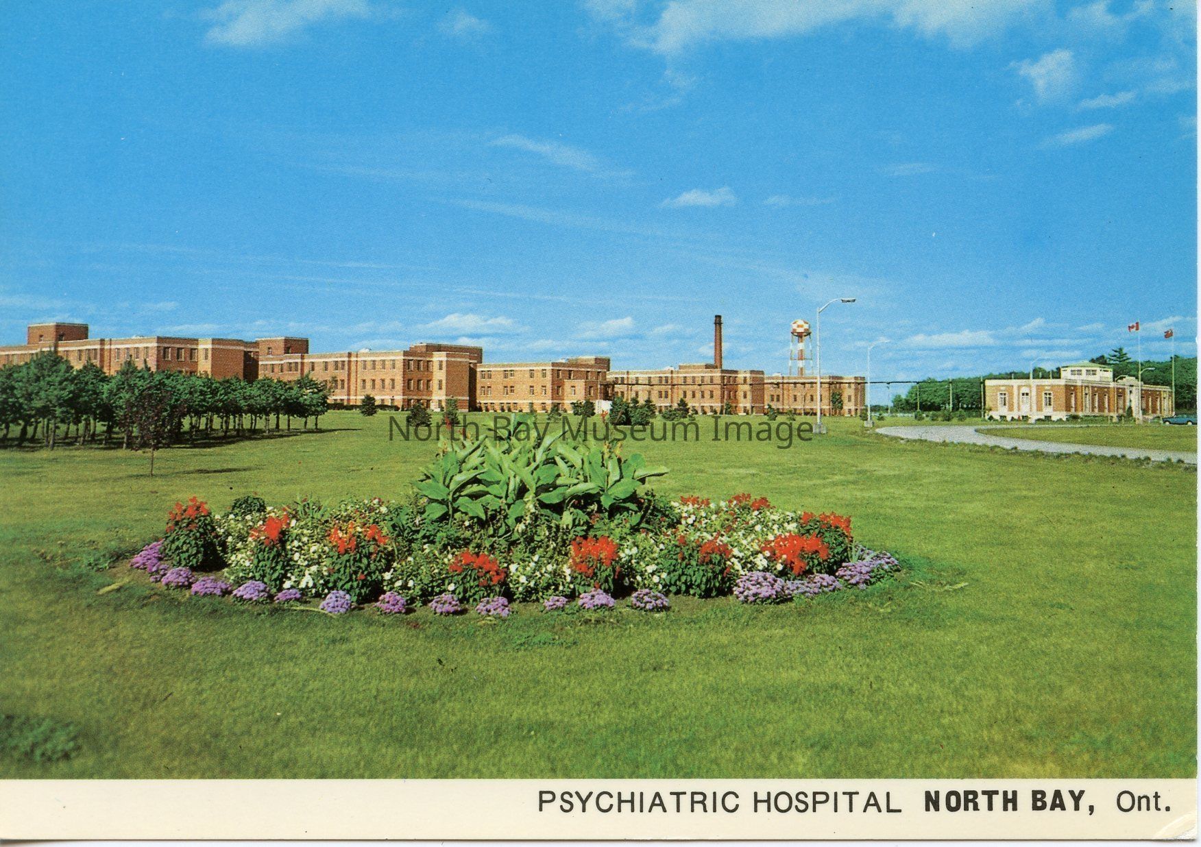 This is a coloured Post card of the Psychiatric Hospital in North Bay, Ontario. The foreground of the image is the grass, gardens and grounds of the hospital. In the background you can see the large brown building that is the Psychiatric Hospital. There is a curving road on the right hand side of the postcard leading to the hospital. In front of the hopsital there are two flag poles flying.