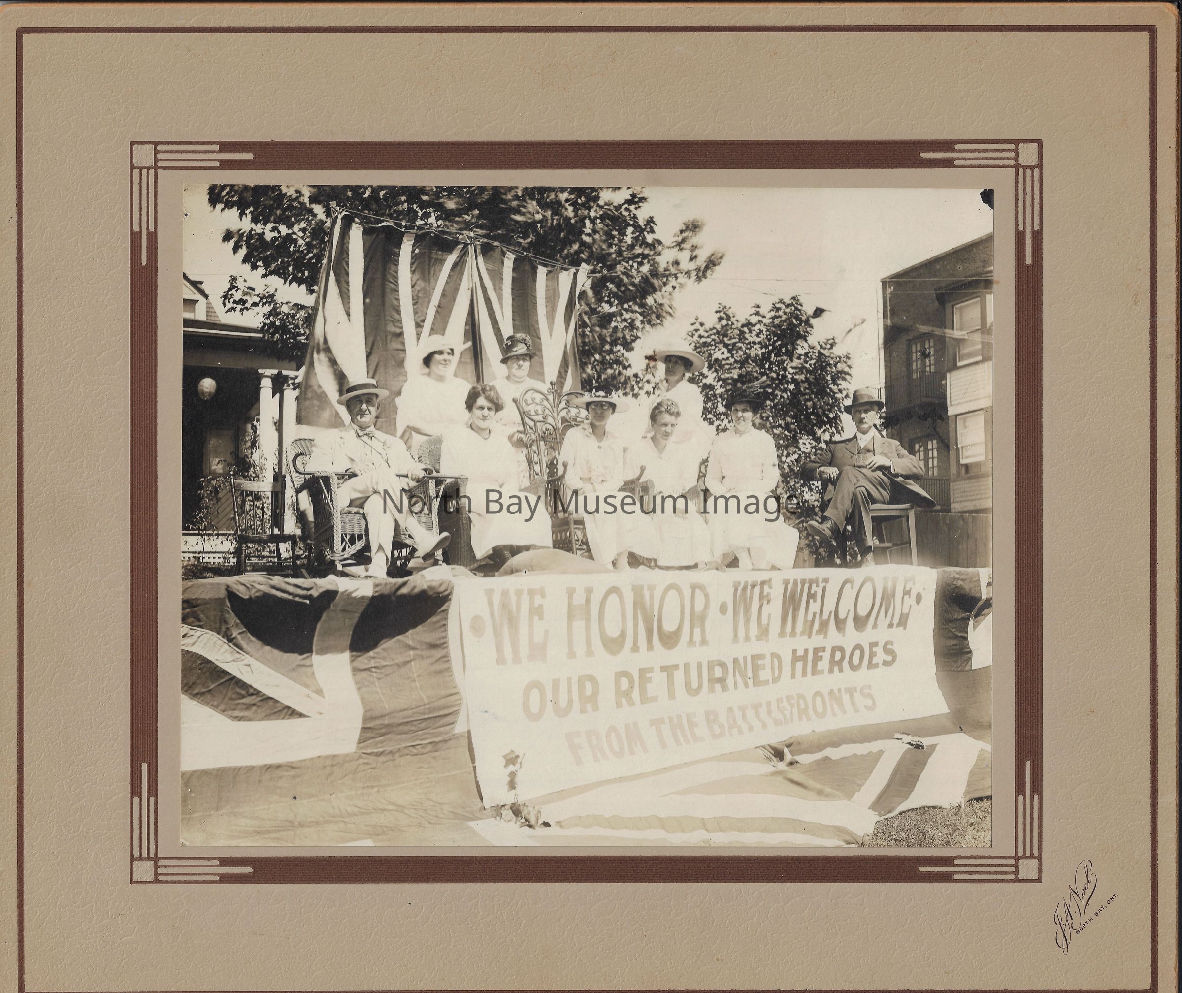 -This is a black and white photograph of a group of 9 citizens of North Bay, a delegation to welcome home the men from the North Bay