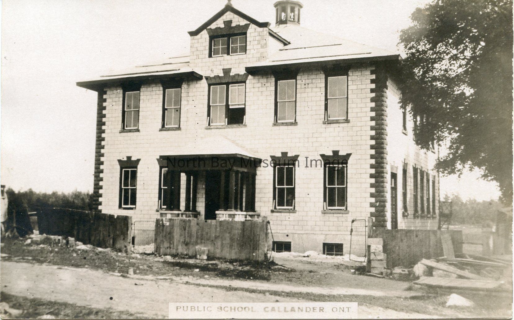 This is a postcard of the "public school" located in Callander On. The postcard has an photo of the two storey school building. There are large windows covering the building. There appears to be a decrepit brown fence in front of the school building. On the right hand corner there appears to be slats of wood, and paint cans.