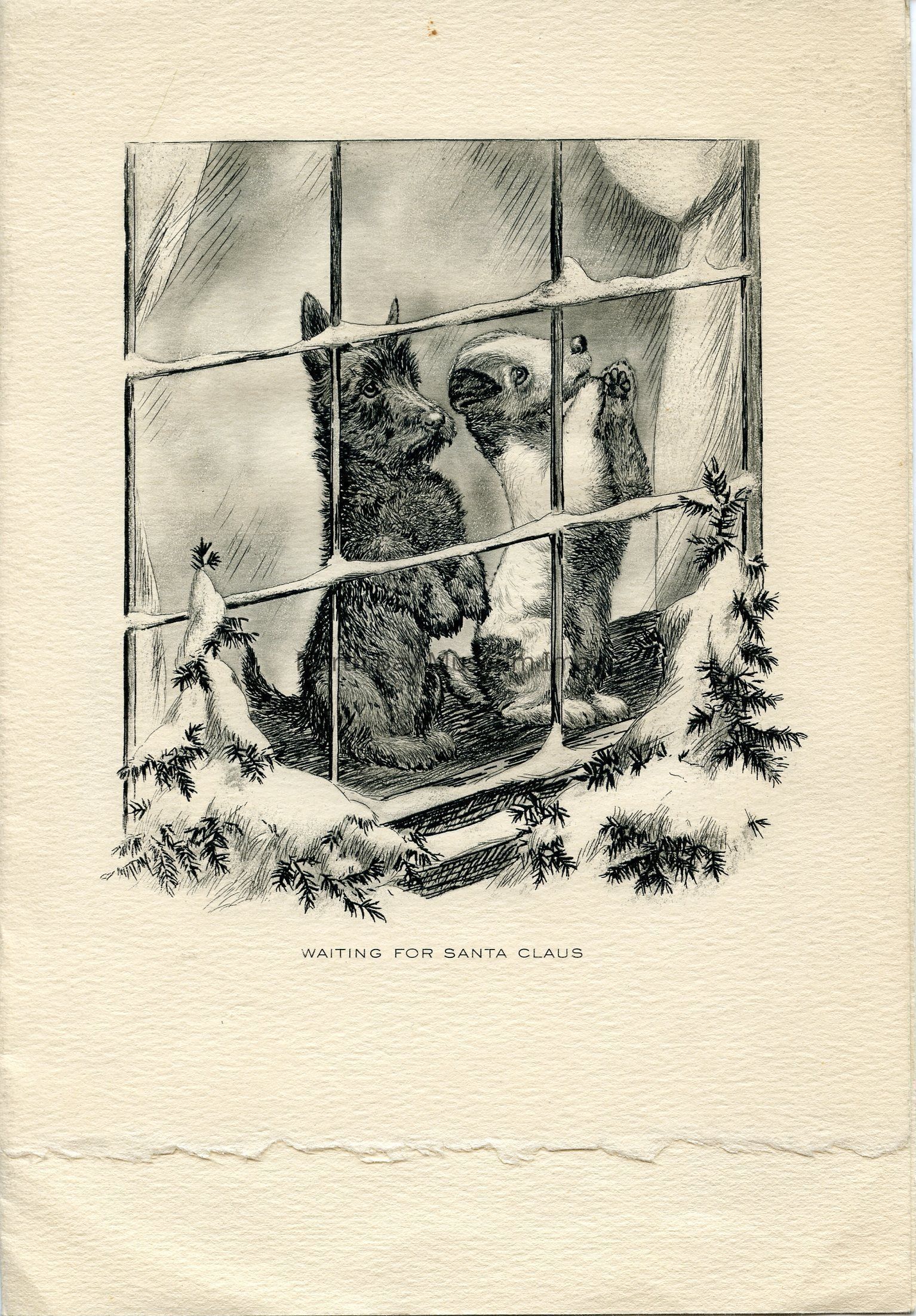 This is a beige Christmas greeting card. In the center there is a black and white illustration of 2 dogs in window. The two dog appear to be standing on the hind legs. The window has frost on it and a little bit of snow.
