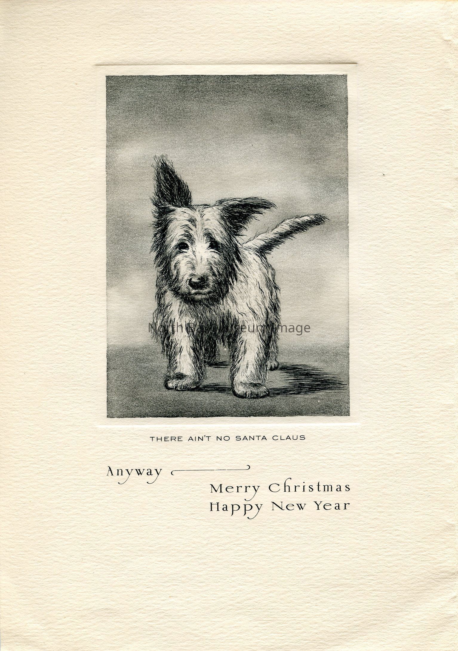 The back of the card has an image of a black dog walking. Below the illustration in black text reads "Merry Christmas and Happy New Year."