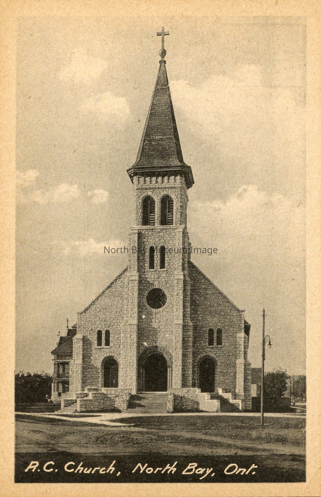 This is a 5.5 x 3.5 black and white postcard of the R.C Church in North Bay, ON. The building appears to be white with a dark roof. The steeple is quite prominent. The photo is taken from farther back so that the whole church can be captured.