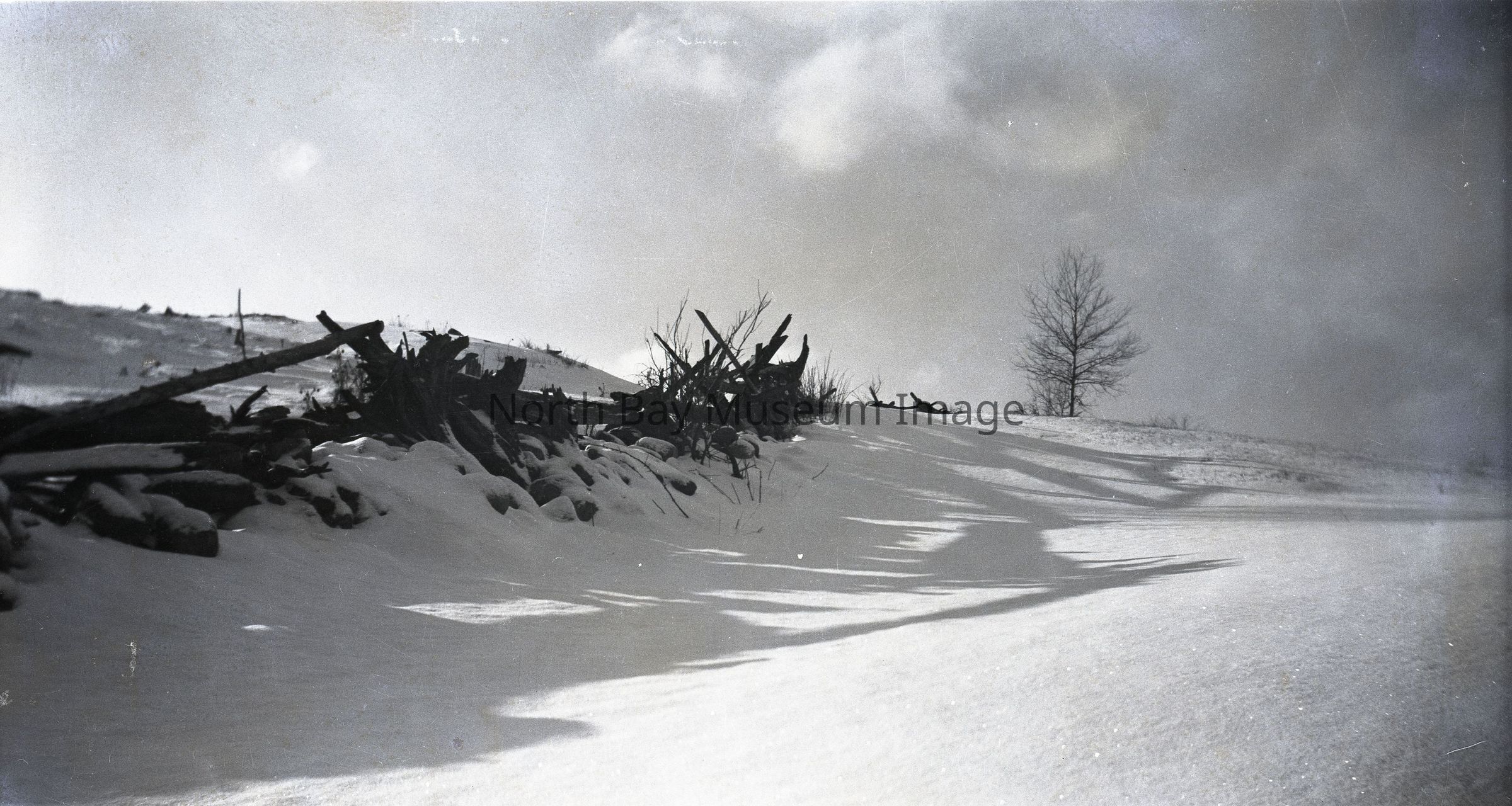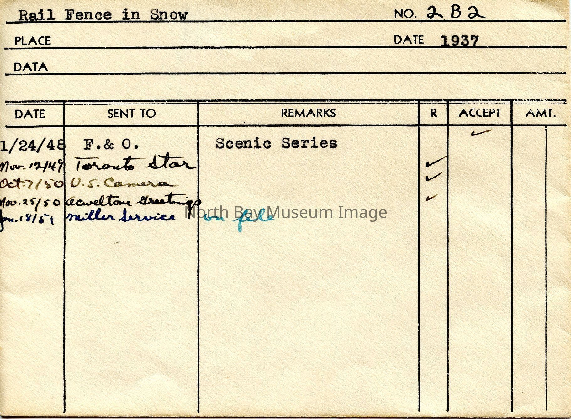 Envelope (a) containing negative (b) and Photograph (c) of a rail fence in the snow. The photo and negative depicts a snow covered rail fence as well as a tree off in the distance. A part of the Forder Collection. The photographers original number is 2B2. All of the photographs publications are listed on the the envelope.Creator