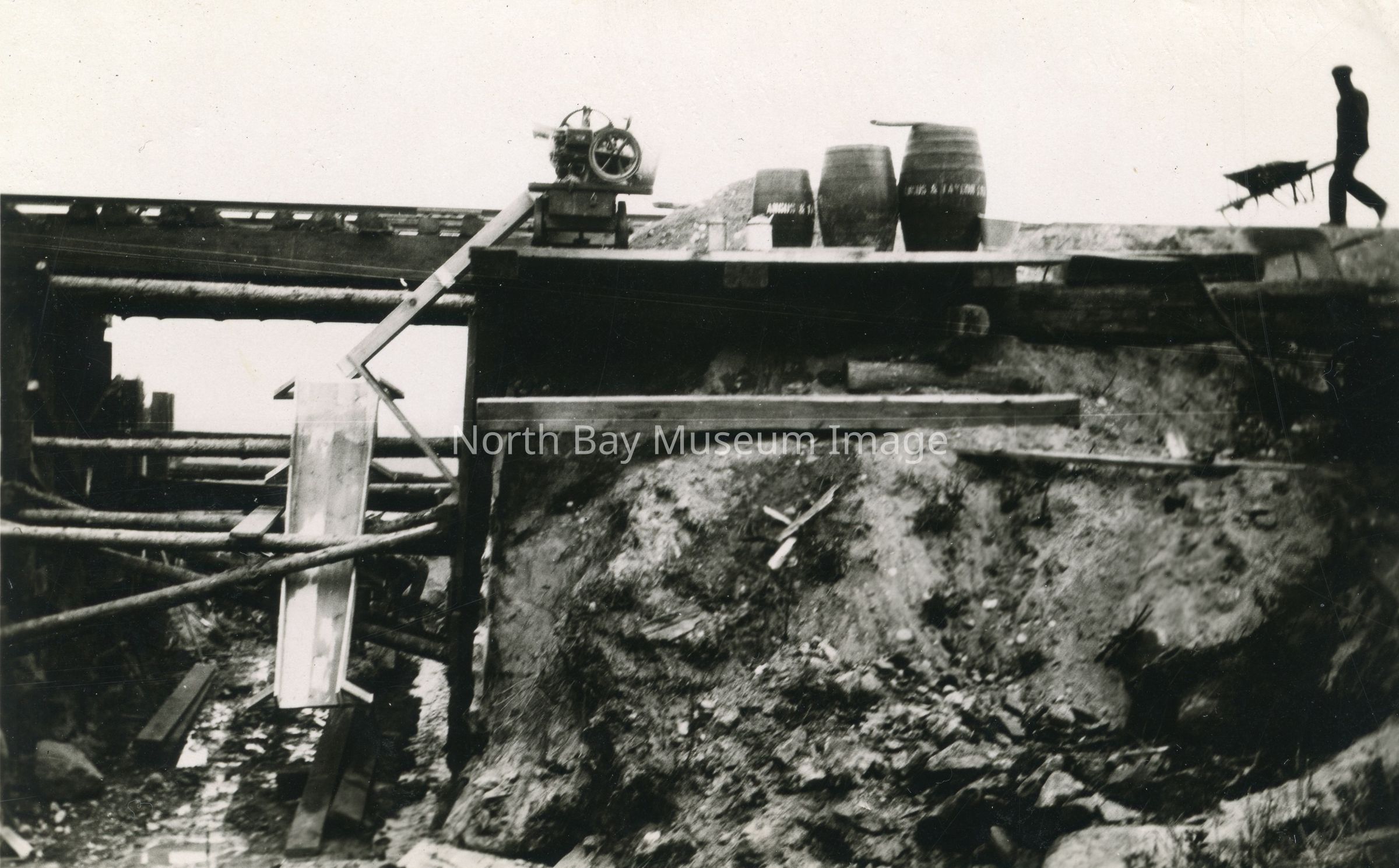 Print, Photographic - black and white photograph - shows railbed - chute runs from tracks to creekbed below - man pushing wheelbarrow along tracks